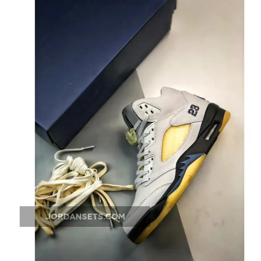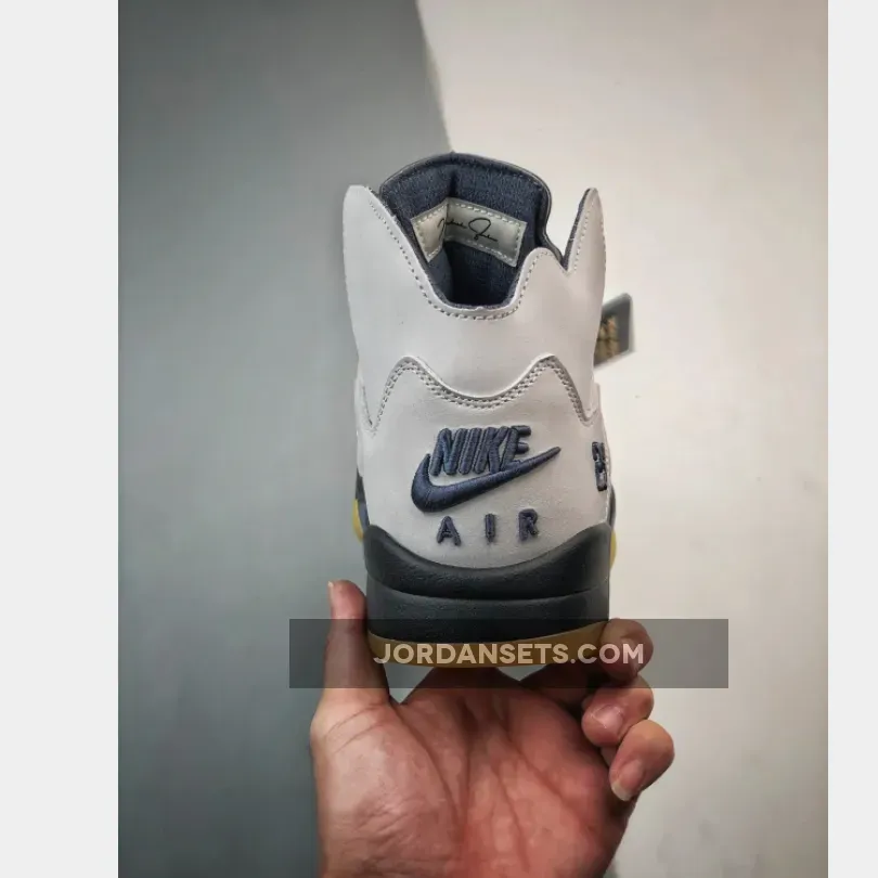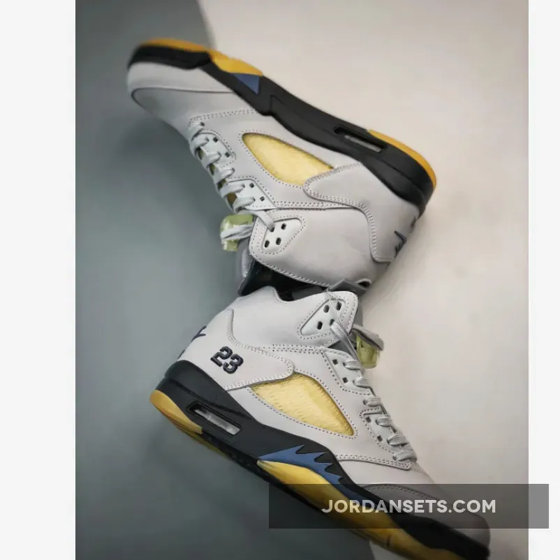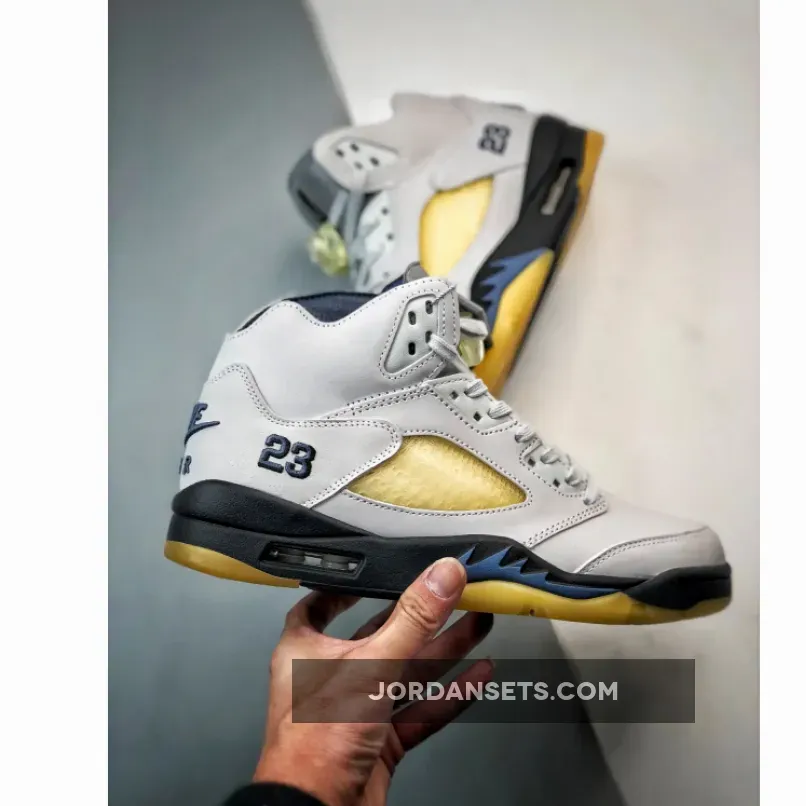 A grey ‘Photon Dust’ leather upper with ‘Diffused Blue’ accenting makes up the upper, with iconic AJ5 design features including the 23 branding on the lateral heel, Nike Air branding on the heel, and the P-51-inspired flames on the midsole.