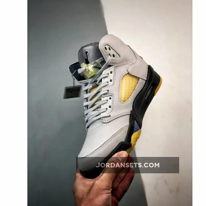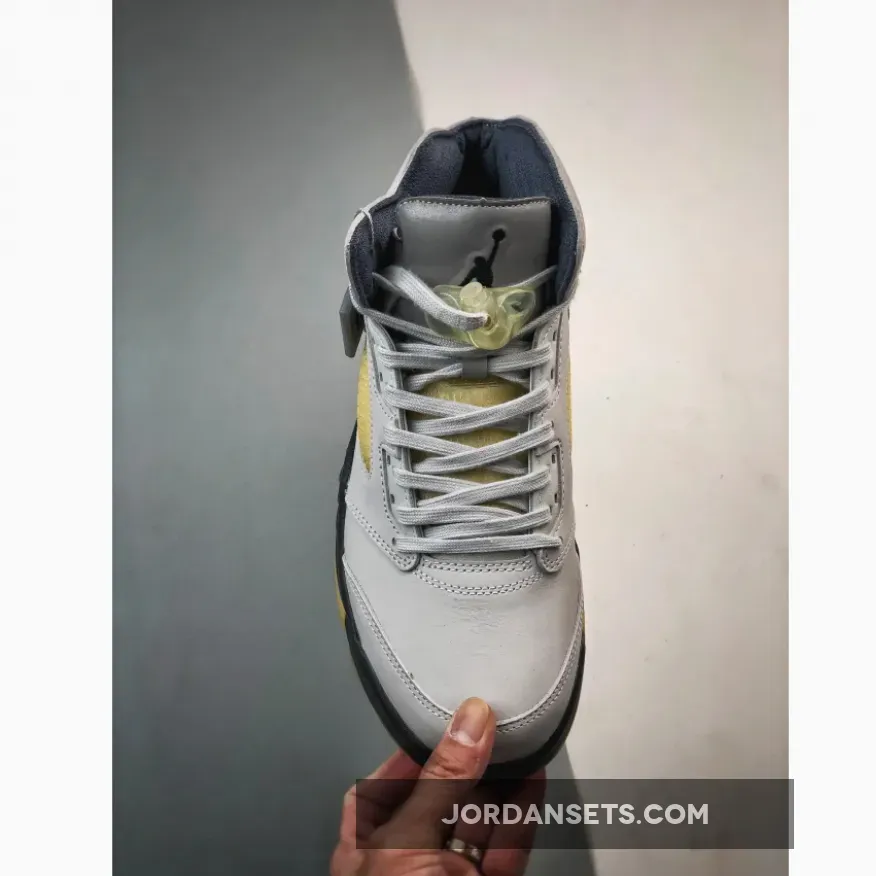 The design features pre-yellowed netting on the tongue and quarter panels, which look to be in a repeating pattern featuring A Ma Maniére’s ‘A’ logo. As the AJ5 is known to be a bit chunky, they’ve slimmed the sneaker down on the ankle collar and tongue, with the latter featuring A Ma Maniére branding and the Jumpman on the respective left and right reflective tongues.