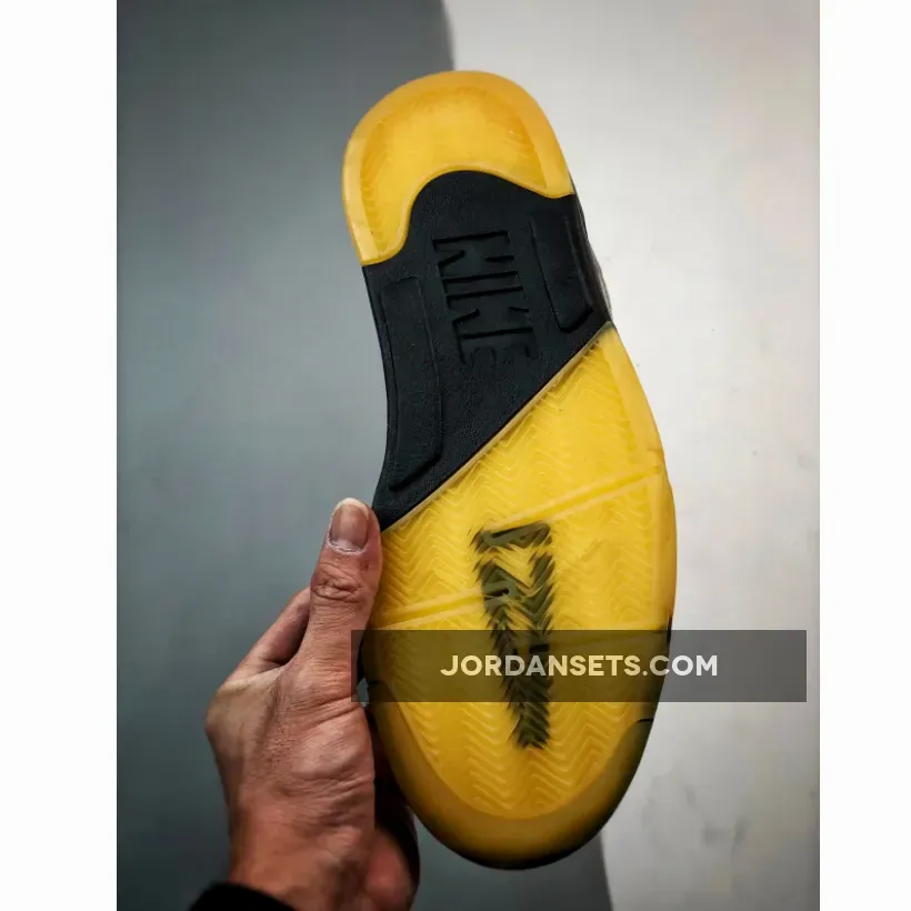 A Ma Maniere’s signature “A” appears in monogram form on the AJ5’s netting as well as the shoe’s lining. The pre-aged look is also seen on the yellowed outsole with the Jumpman appearing to finish off the sneaker.