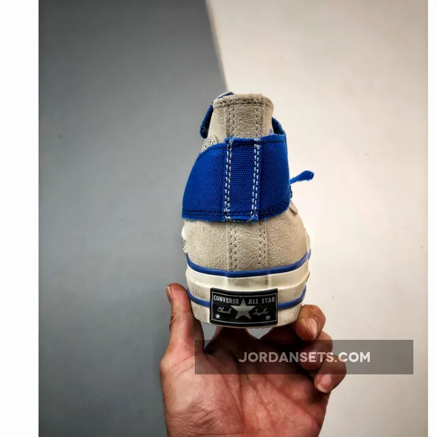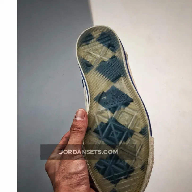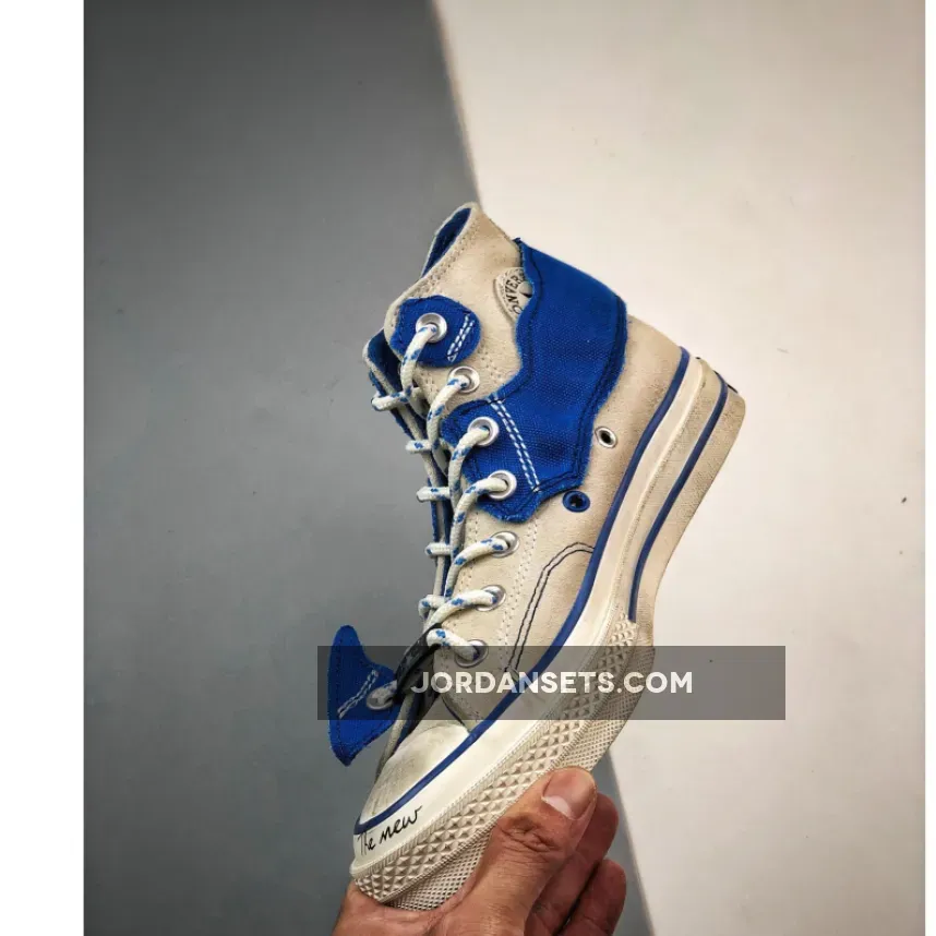 The collaborative pairs are found predistressed with a number of unconventional and deconstructed elements including double-laces intertwining both conventional and rope laces, contrast-stitched tongue tabs, and cutout blue canvas panels stretching around the metal eyelets. The title slogan is printed across the sides and “The New” and “Not New” text is found in cursive on the tip of the toe. Rounding out the look are classic outsoles featuring blue piping accents, black heel banners, and semi-translucent checkerboard bottoms.