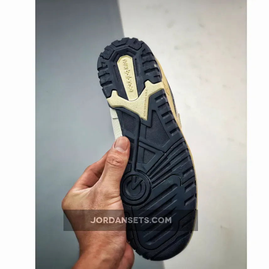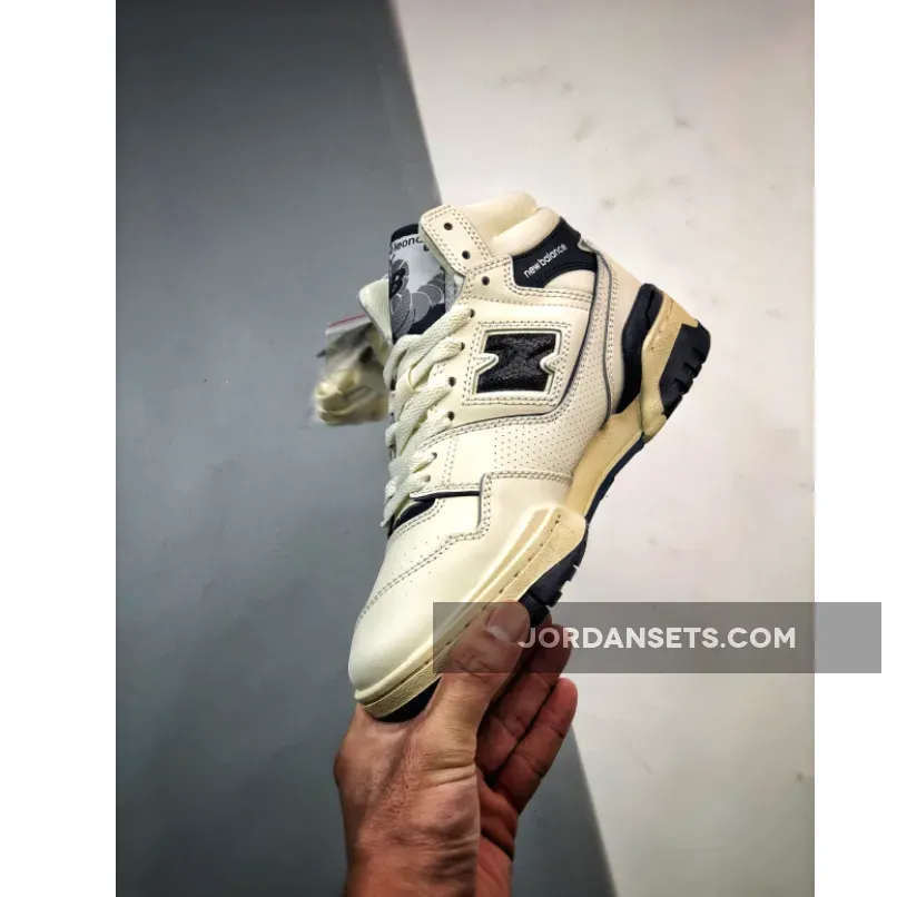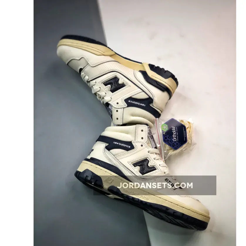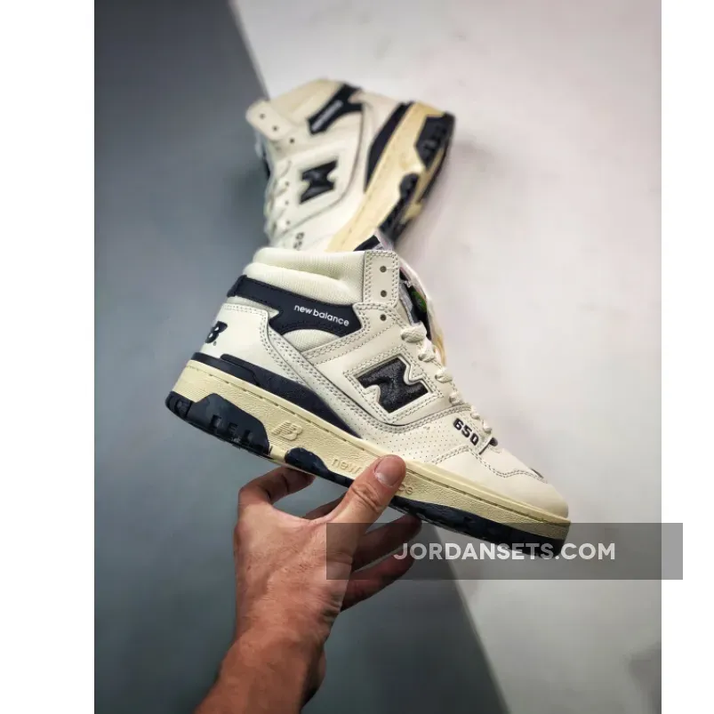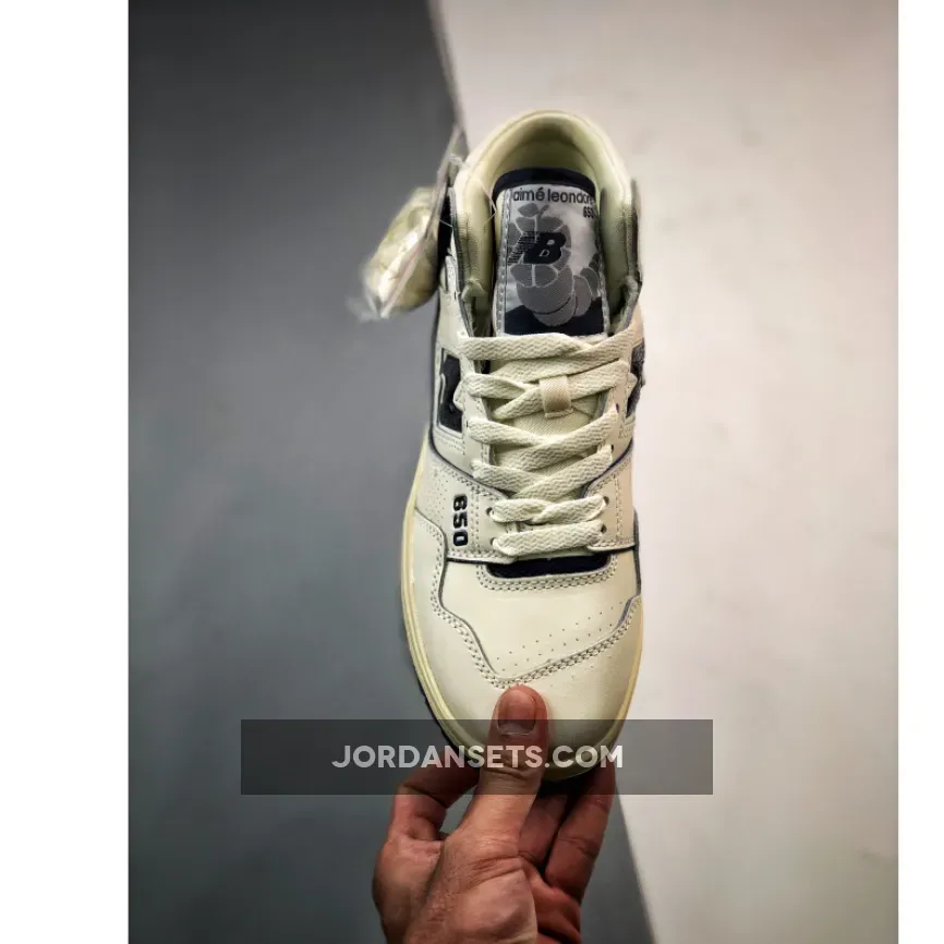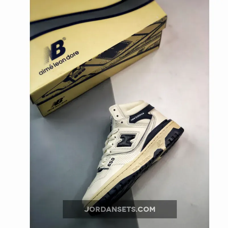 The Aimé Leon Dore x New Balance 650R ‘Navy’ presents a retro high-top inspired by the creative partners’ P550 collaboration. The upper is crafted from white full-grain leather with a puff-and-stitch mesh collar and microperforated detailing on the midfoot overlay. Contrasting navy accents include the cracked leather ‘N’ logo on the quarter panel, along with mismatched ALD and NB branding the heel of the left and right shoe. Anchoring the sneaker is a traditional rubber cupsole, featuring aged sidewalls that accentuate the shoe’s vintage hardwood aesthetic.