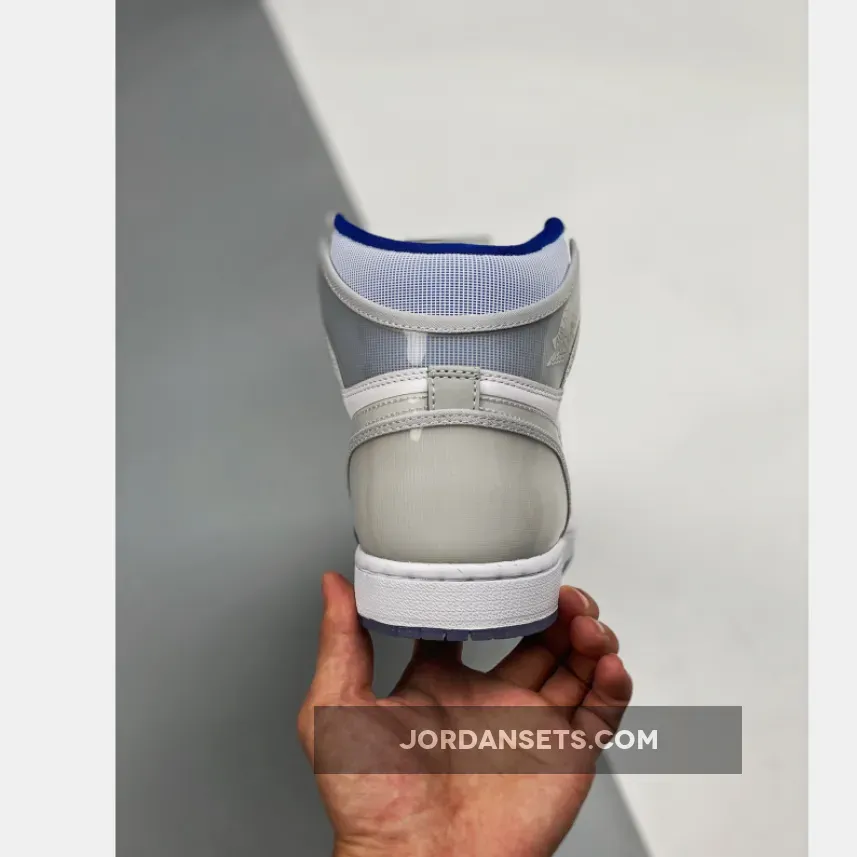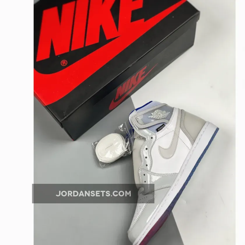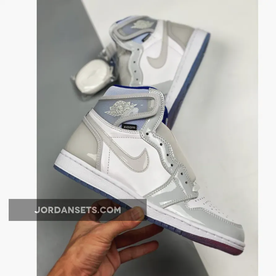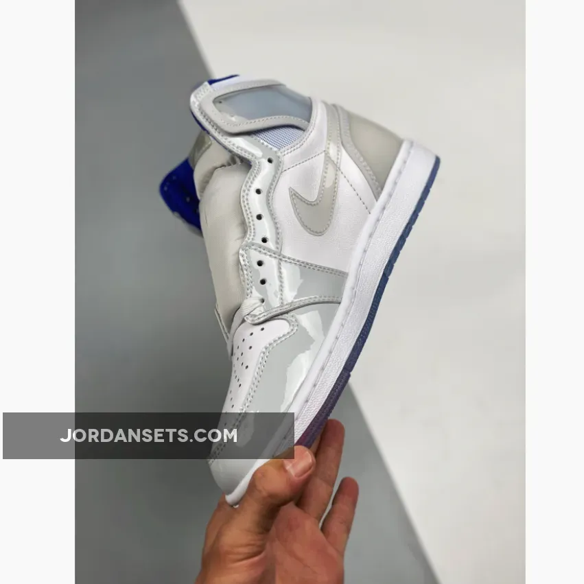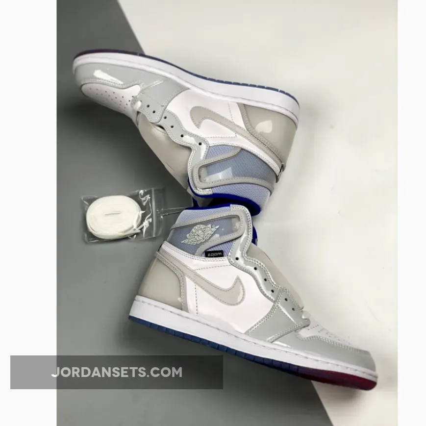 Dressed in a White and Racer Blue color scheme. This Air Jordan 1 High comes constructed in a mix of mesh, patent leather, tumbled leather, and translucent TPU overlays. Other details include a “Zoom” tag on the lateral side, along with “Zoom Air” branding on the tongues and insoles.