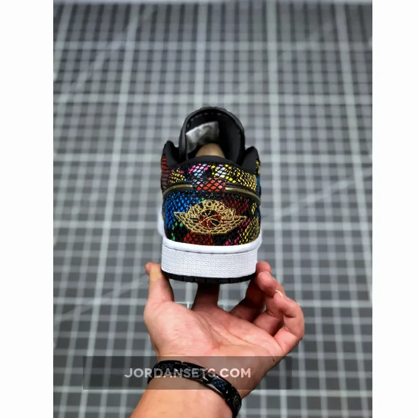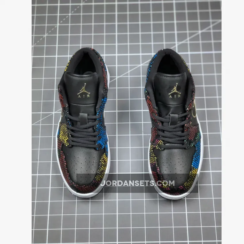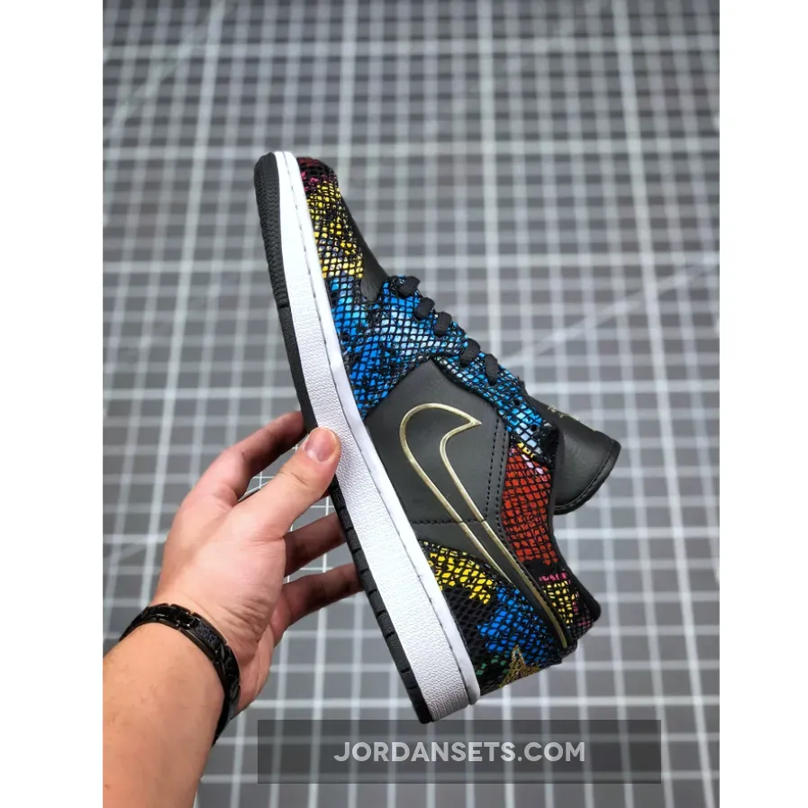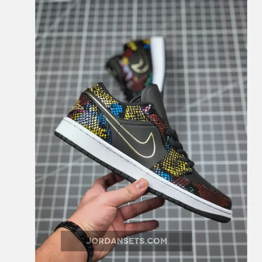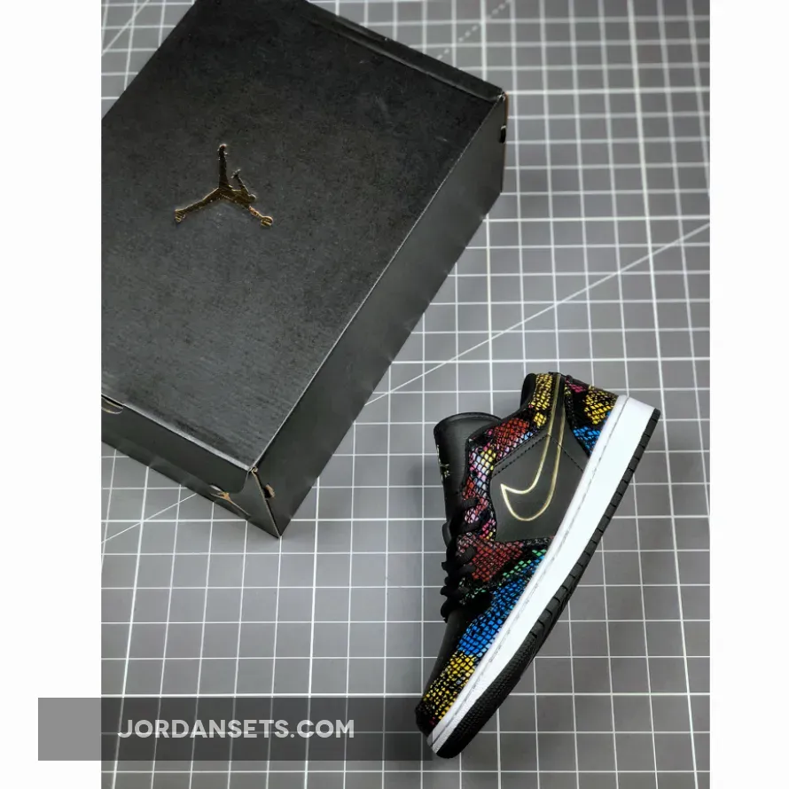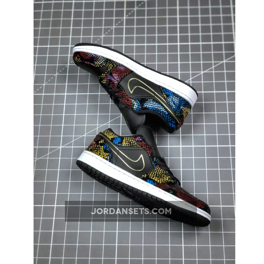 This offering of the low-top Air Jordan 1 features a Black smooth leather upper detailed with multicolored snakeskin overlays that resembles traditional African hues.
