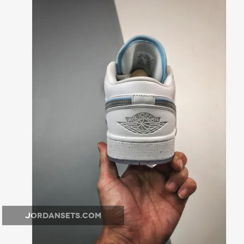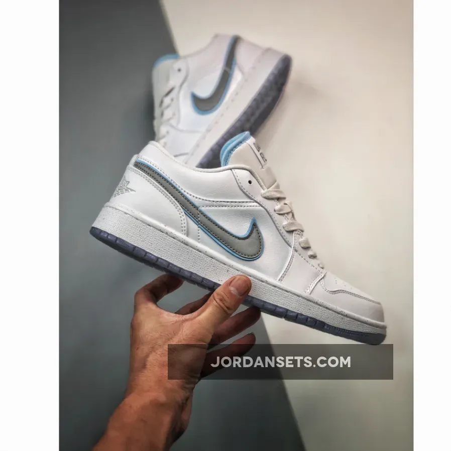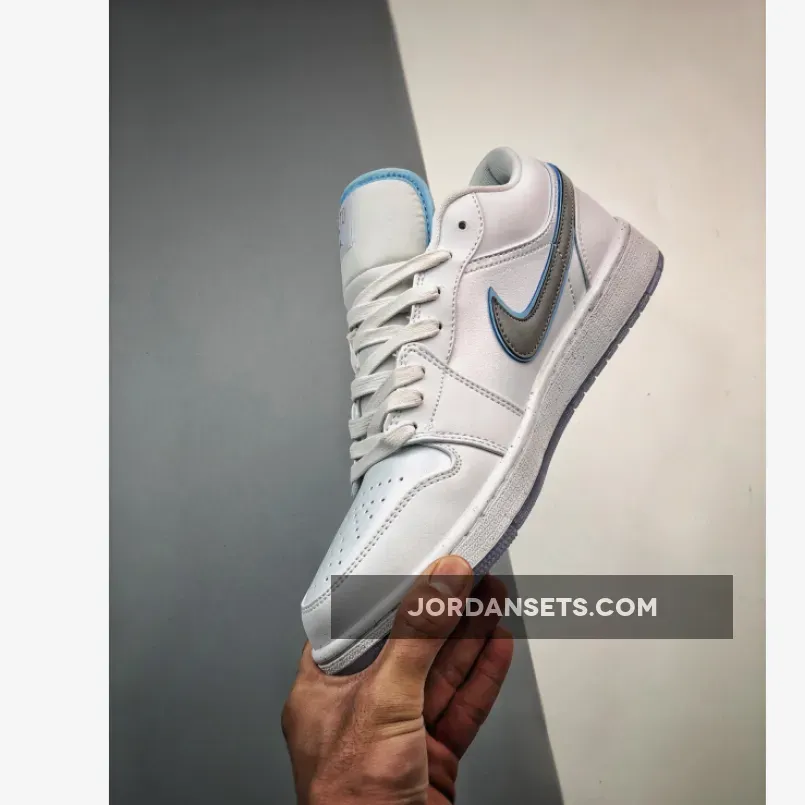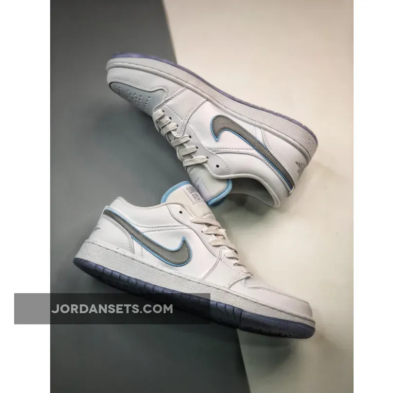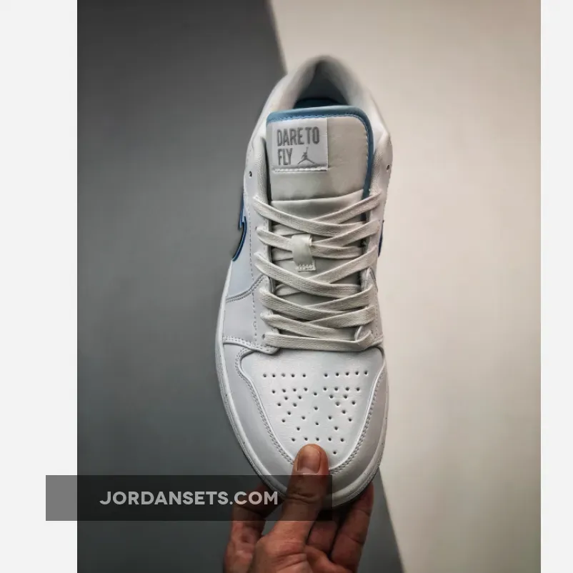 Michael Jordan’s Air Jordan 1 basketball sneakers that debuted in 1985 is one of the most popular lifestyle trainers today, thanks to collaborations, celebrity endorsements, and premium colourways. One of the iterations that fit this criteria is the Air Jordan 1 Low Dare To Fly White Grey and we have the official images here for a closer look.Arriving with a low-top profile, this AJ1 features a premium leather upper in a crisp white hue. Conrasting details arrive via MJ’s Wings insignia on the heels and the Swoosh logos on the lateral and medial sides coloured in grey outlined with a UNC blue tint. Unndeniably, this looks similar to the iconic Air Jordan 1 Neutral Grey OG colourway but the main differences are the reflective Swooshes and Wings, speckled Air midsole underfoot, and translucent blue outsole.