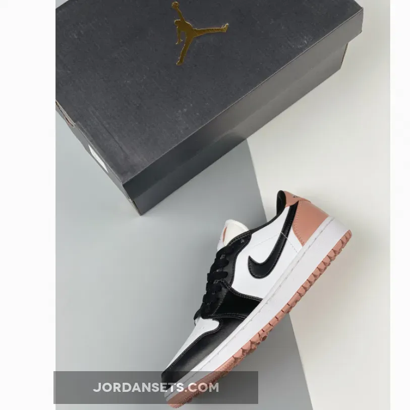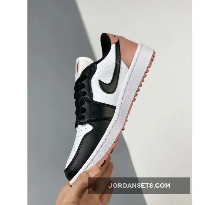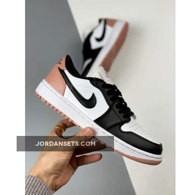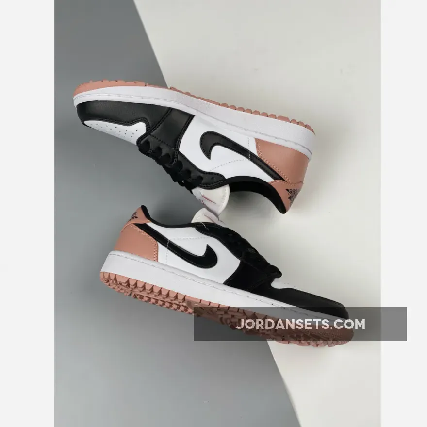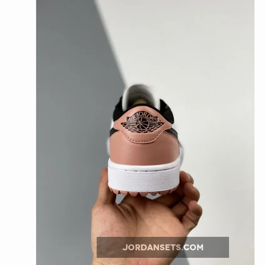 The Jordan Brand’s Air Jordan 1 golf line built with soles designed for the fairway, the Air Jordan 1 Low Gold, has a new offering featuring a black toe and a touch of rose. Get ready for the Air Jordan 1 Low Golf Rust Pink. This low-cut AJ1 Golf starts out with a “colourless” smooth leather base showing on the perforated toe box and the mid-panels. The smooth leather overlays on the toe cap, the mudguard and eye stay panels are all in contrasting pitch black. The laces, signature profile Swooshes on both the medial and lateral mid-panels and the plush sock liners all jump on the black bandwagon. A lovely shade of Rust Pink enters the picture on the leather heel tabs showing off black embossed “Wings” logos, the heel counters, the Jumpman branding on the tongue labels and the insoles.
