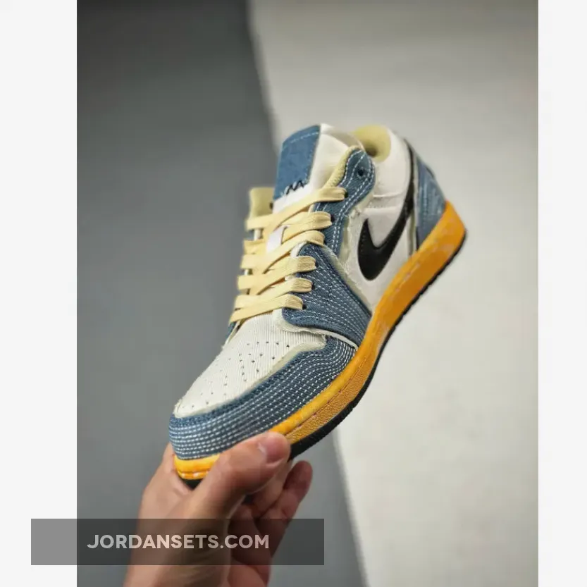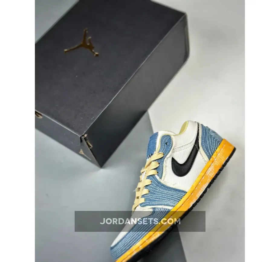 this Air Jordan 1 Low comes with White canvas on the base, distress and worn-like denim fabric on the overlays around the toe box, forefoot, eyestays, and heels. Utilizing an aged look, the shoes also have frayed edges and Black tumbled leather Swoosh logos. Exposed stitching runs throughout with exposed foam on the tongues and ankles. Other details include an aged midsole, Cream laces, a graphic on the insoles, and a Black rubber outsole.
