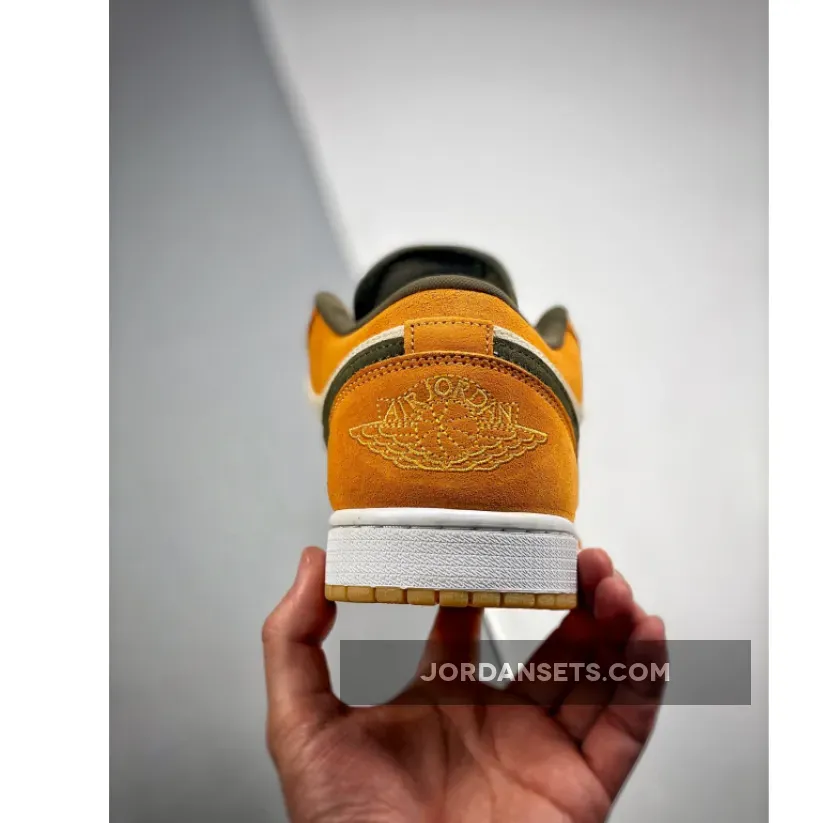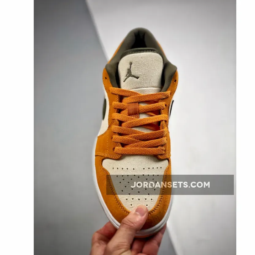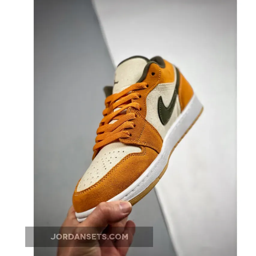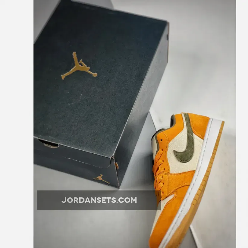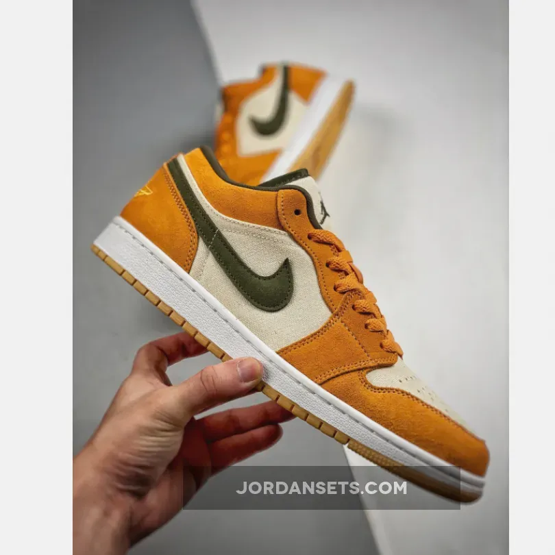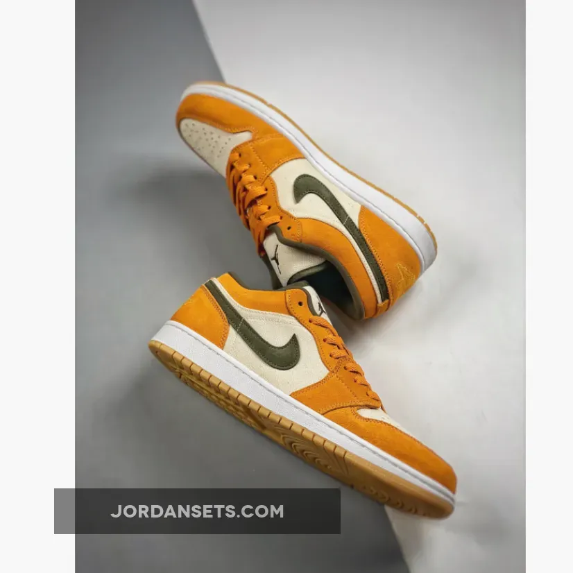 These Air Jordan 1 Lows are ?! Love the vibrant orange & olive combo. Canvas base is cool ?. Fast shipping, too! ✈️ #AJ1Low #SneakerLove ?✨