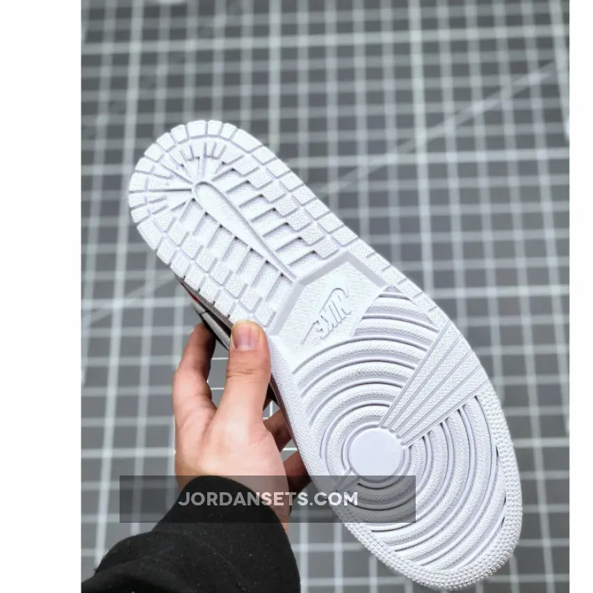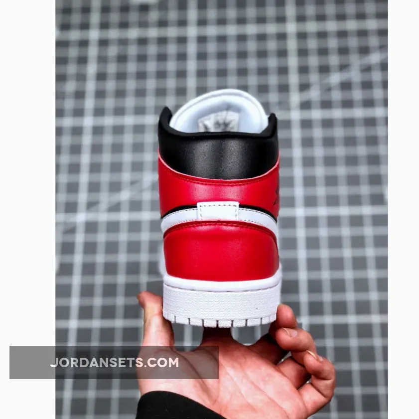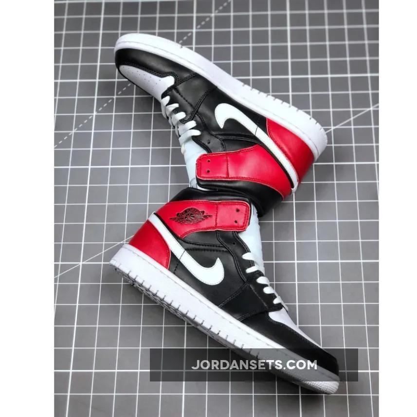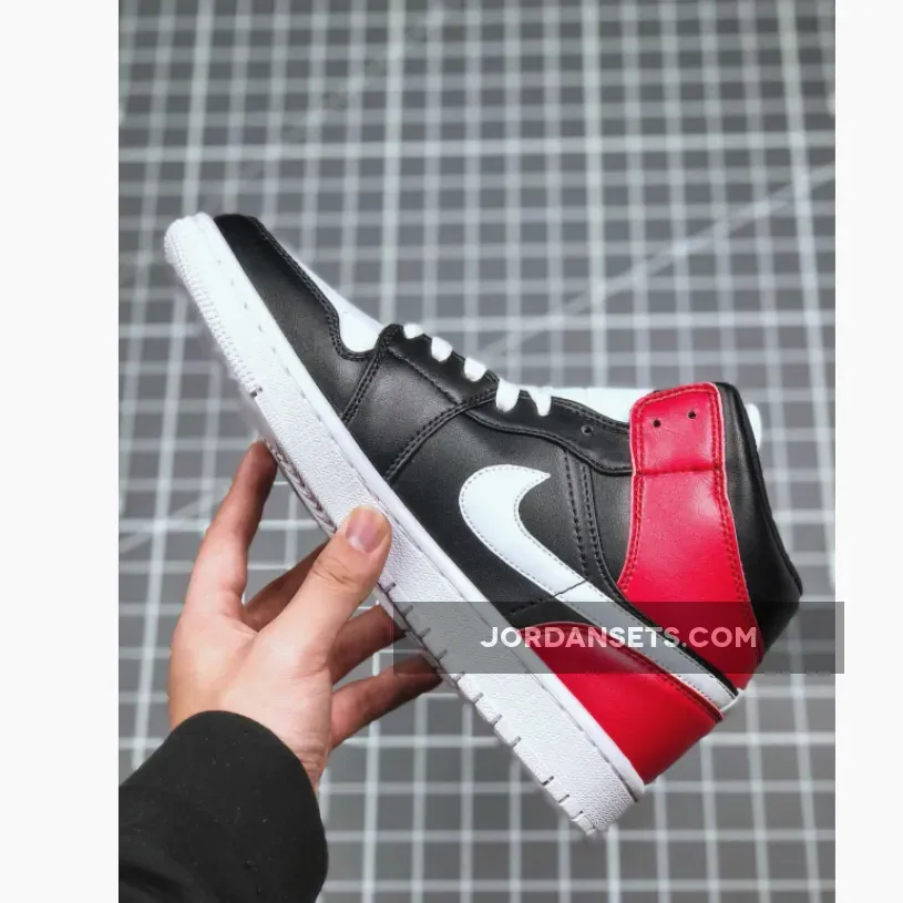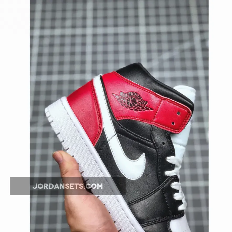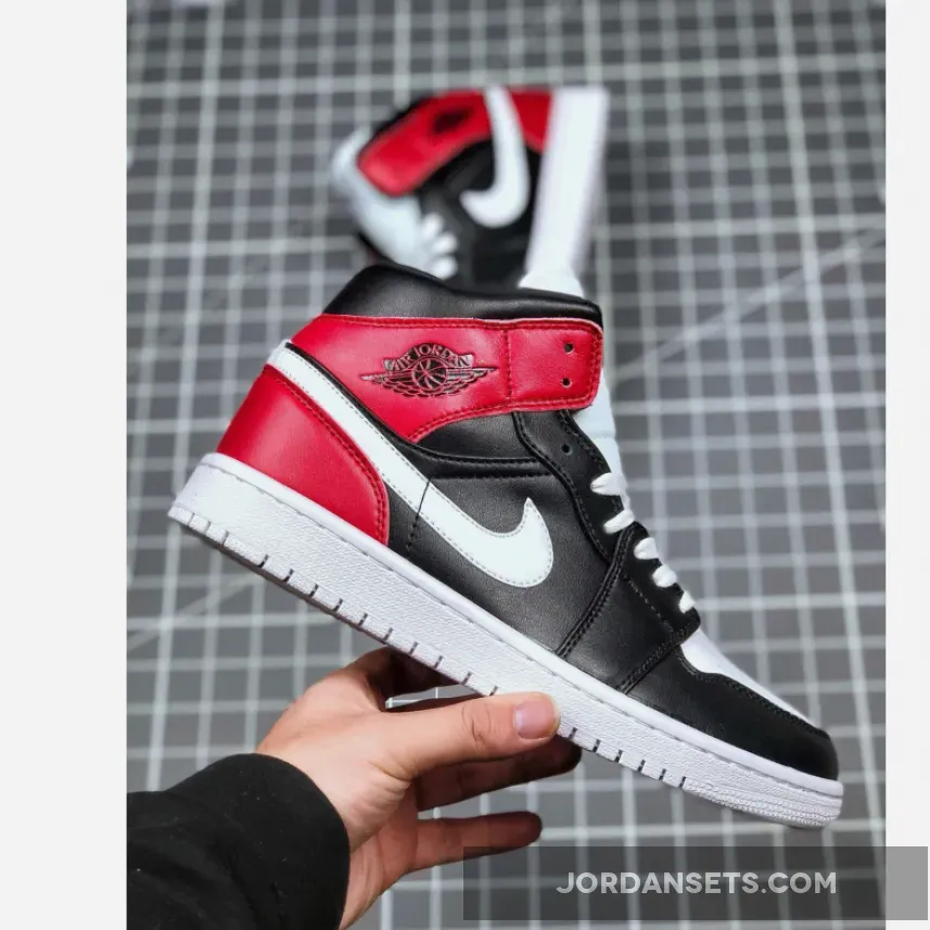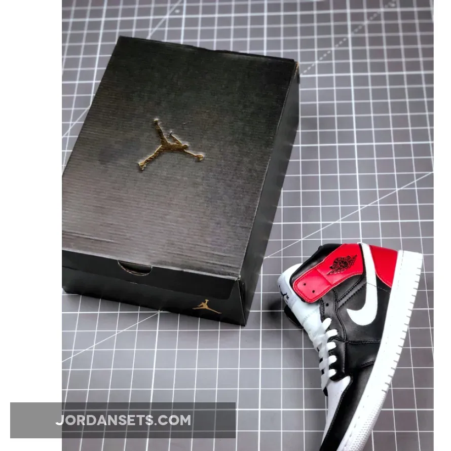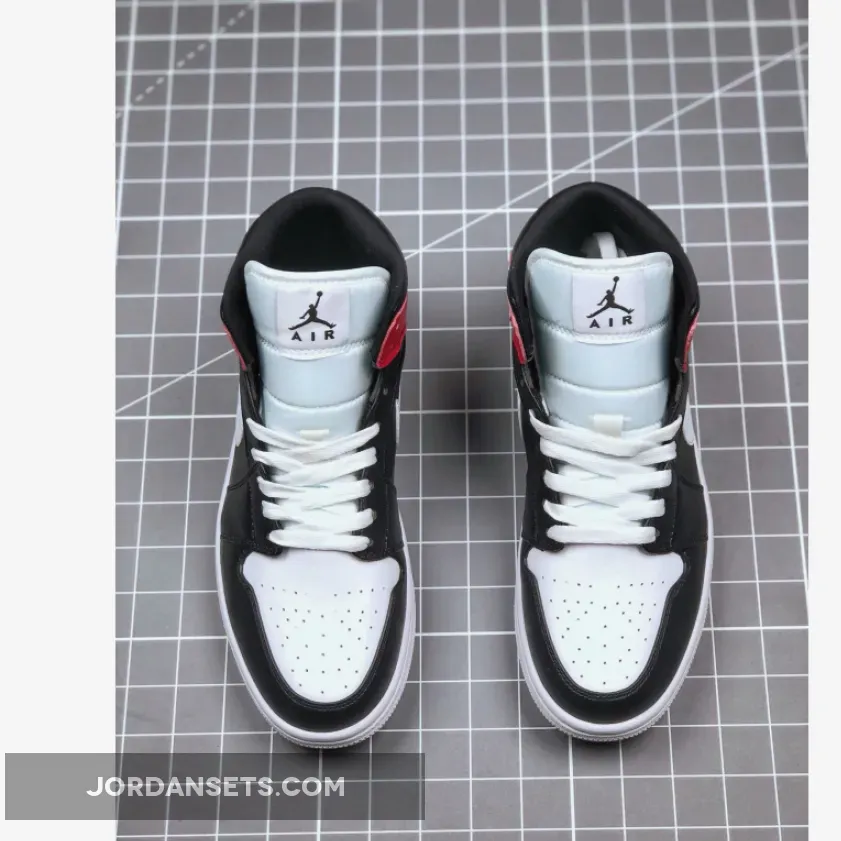 This offering of the mid-top Air Jordan 1 features White leather on the toe and Swoosh with Black leather overlays on the toe, side panels and upper collar. Noble Red is used around the heel completed with a solid White rubber sole.