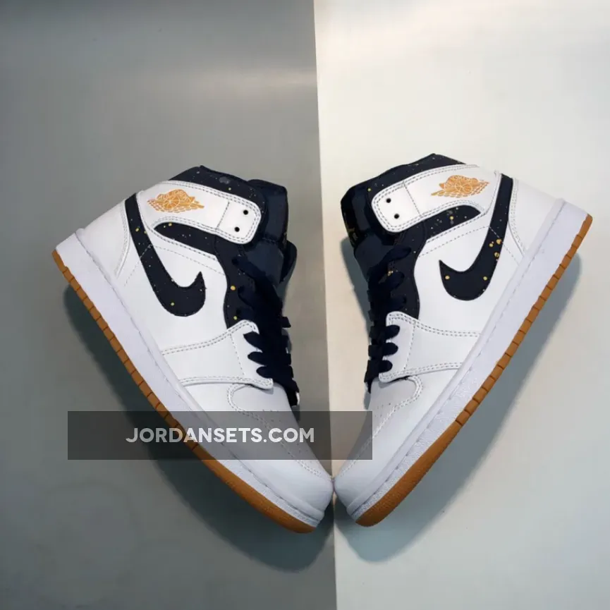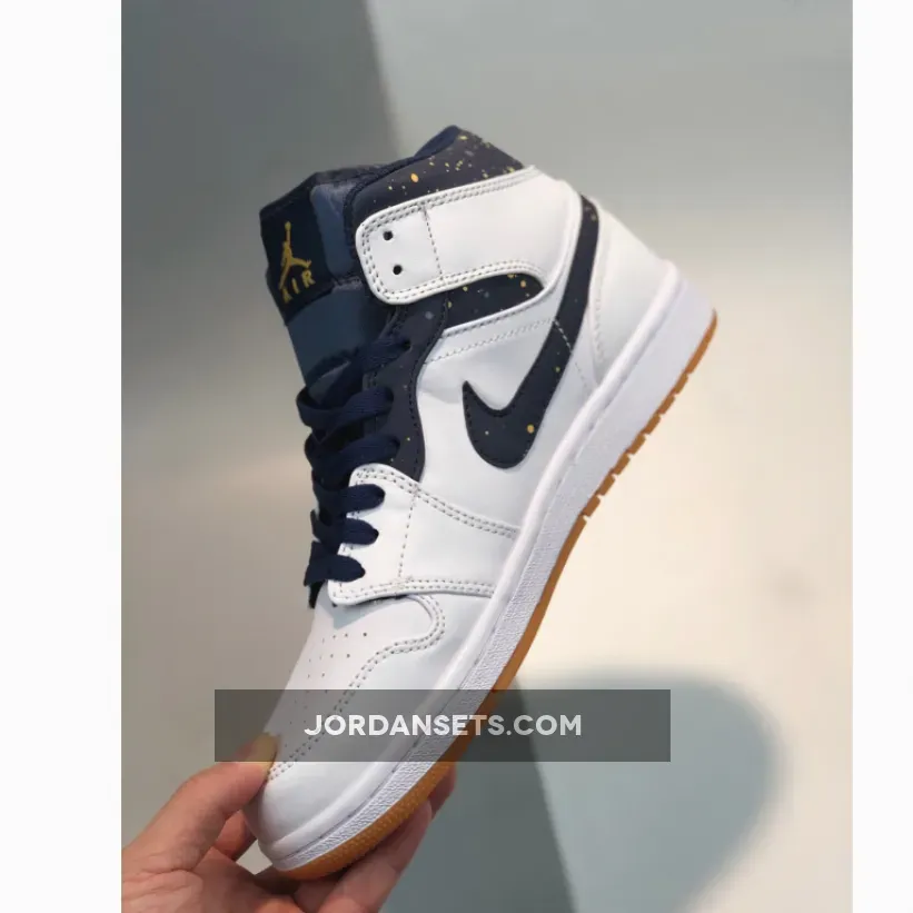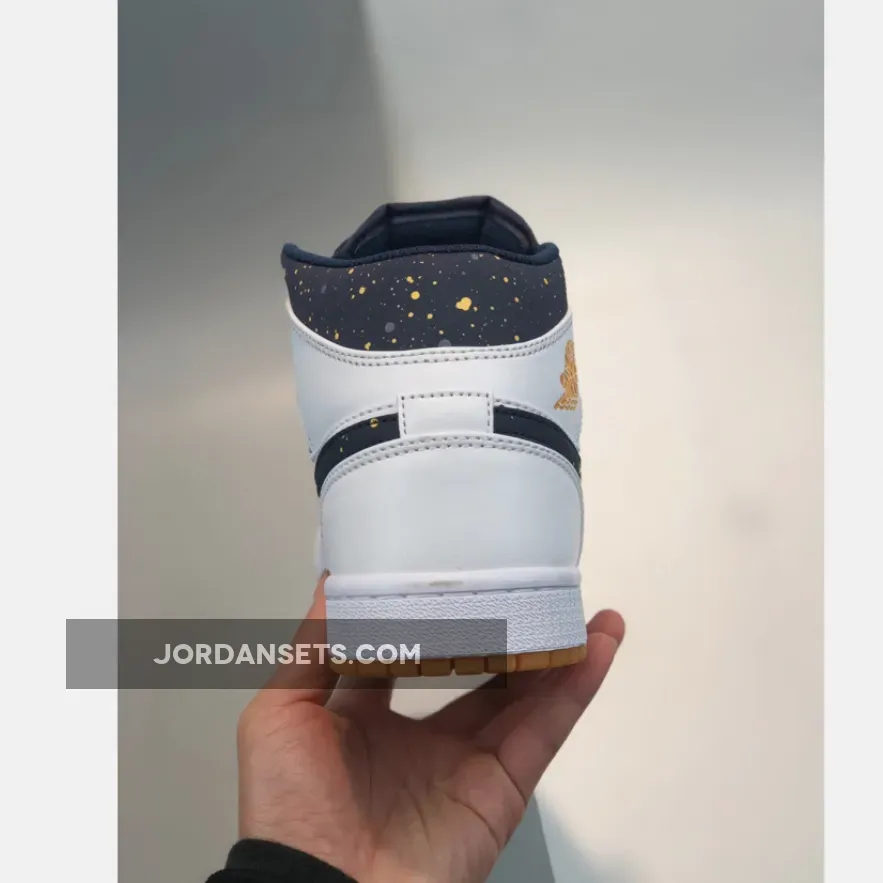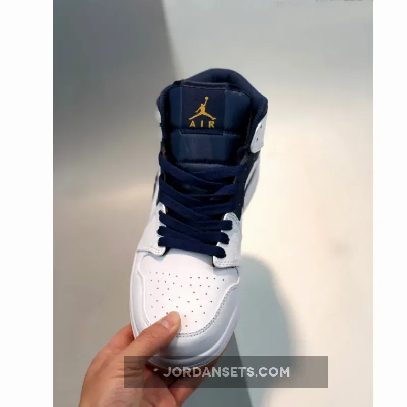 The Air Jordan 1 Mid “Jeter” sports a white leather base that covers the perforated toe, mid-panel, and heel. A speckled navy leather Swoosh branding hit appears on the mid-panel with a navy speckled leather eyelet panel and ankle collar adding to the contrasting. Navy laces, a bronze accented Jumpman logo on the blue tongue tab and bronze Wings logo on the collar complete the upper.