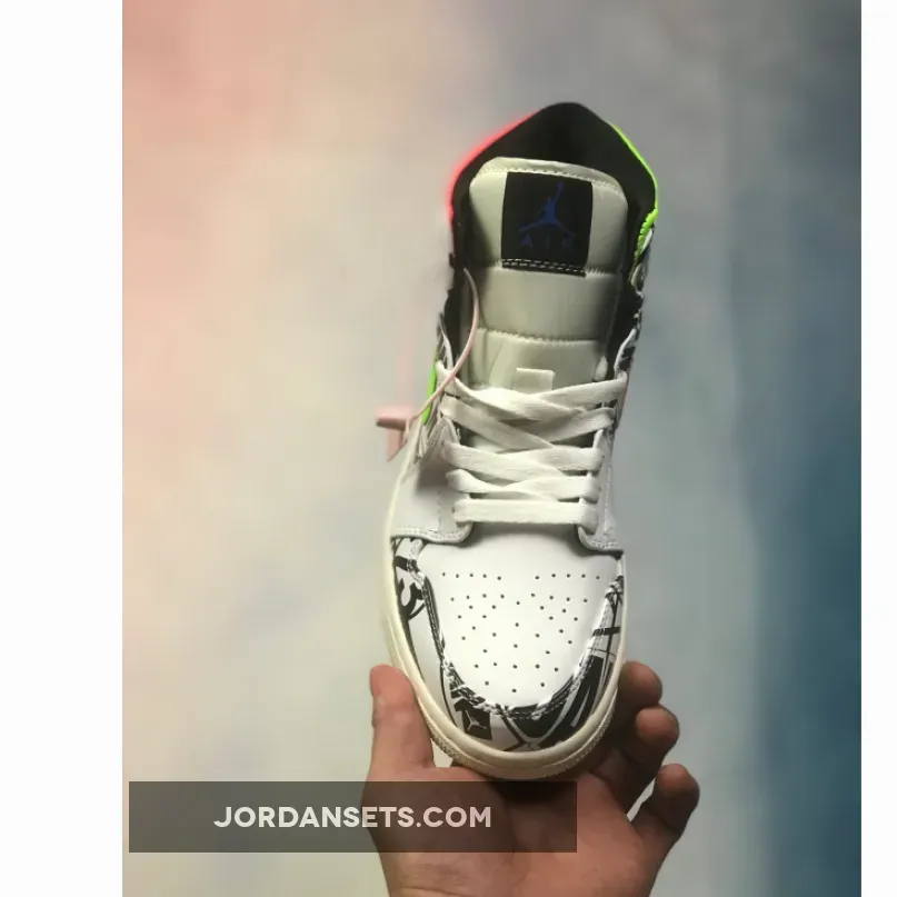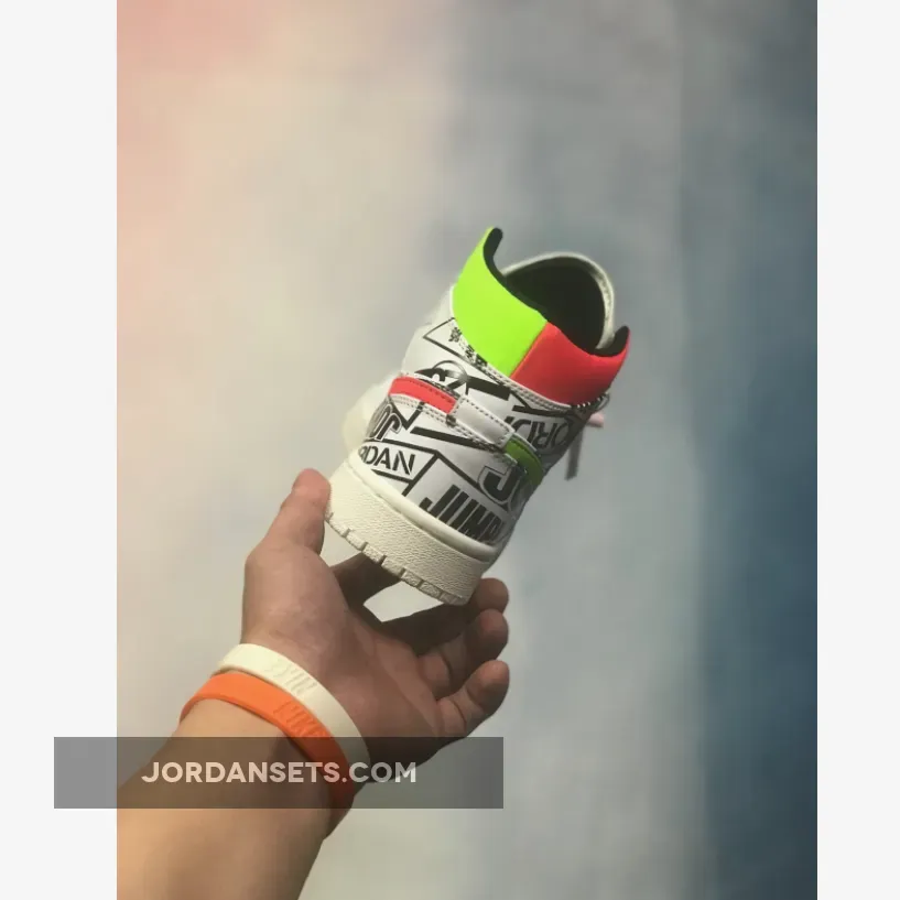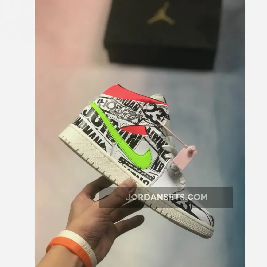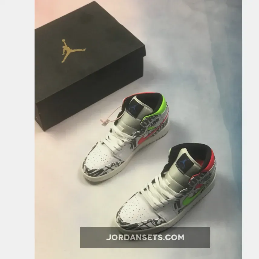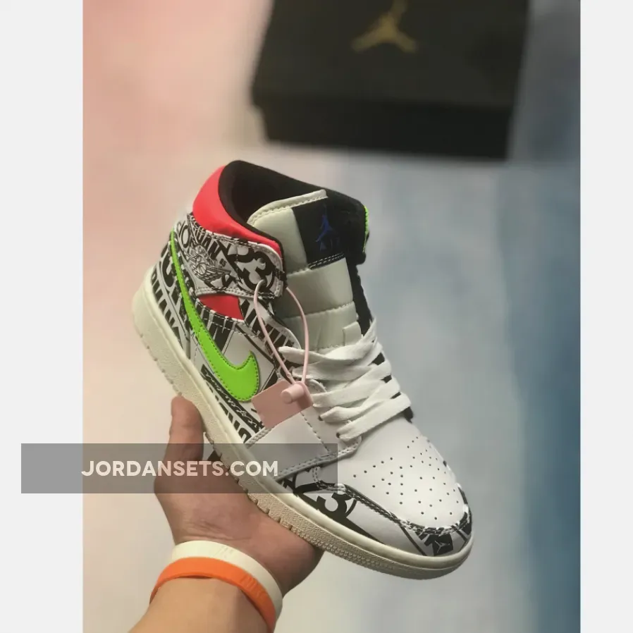 this Air Jordan 1 Mid features White leather across the upper which different styled Jordan branding is seen throughout in Black. This pair also has a two-tone theme while Green lands on the lateral Swoosh and Red on the medial. Finishing the look is the same two shades split across the collar.