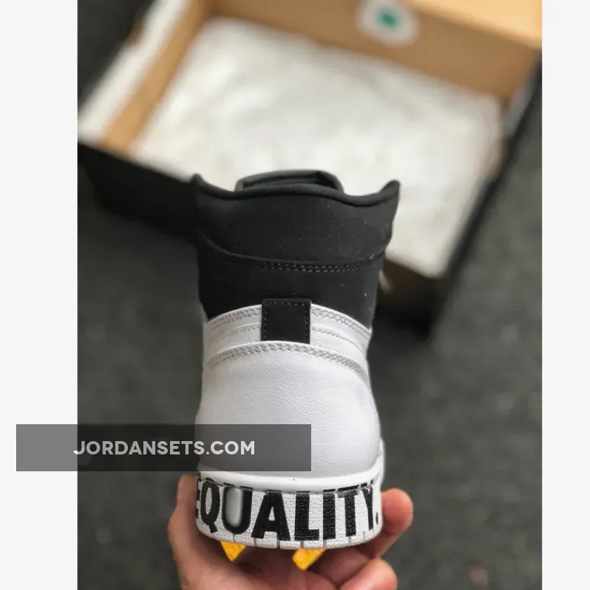 Dressed in a Black, White, and Metallic Gold color scheme. This Air Jordan 1 features majority of the upper in Black and the lower half in White. Highlighting the shoe is the word “EQUALITY” printed on the back heels.