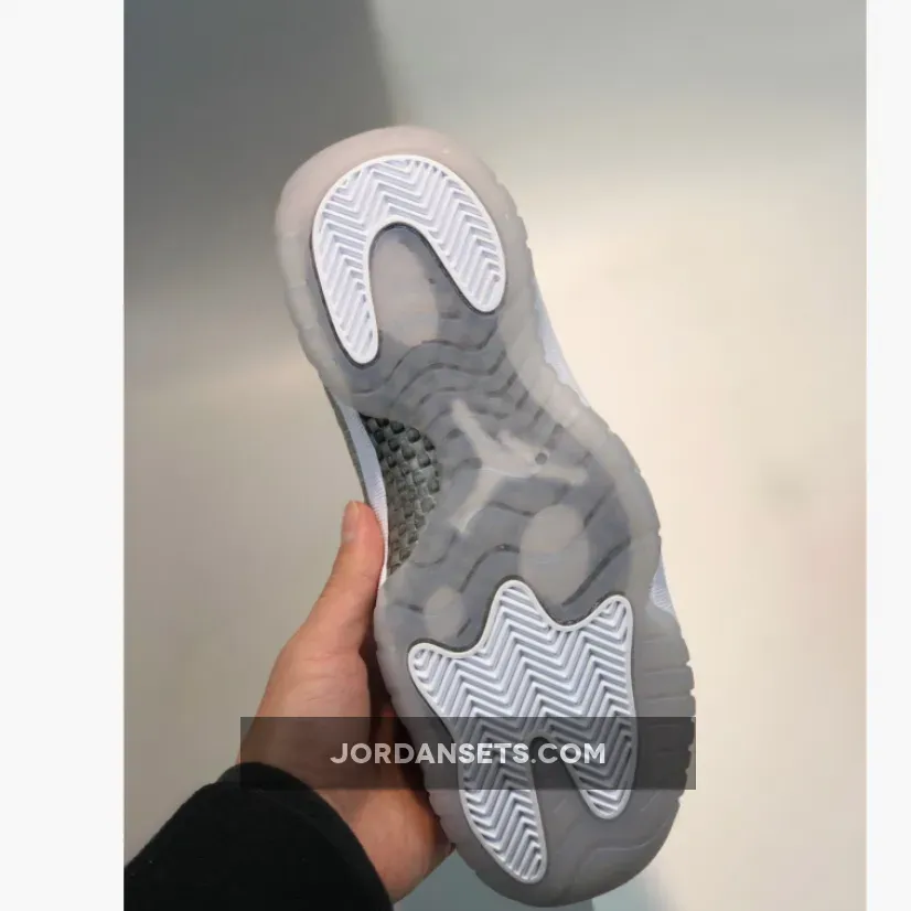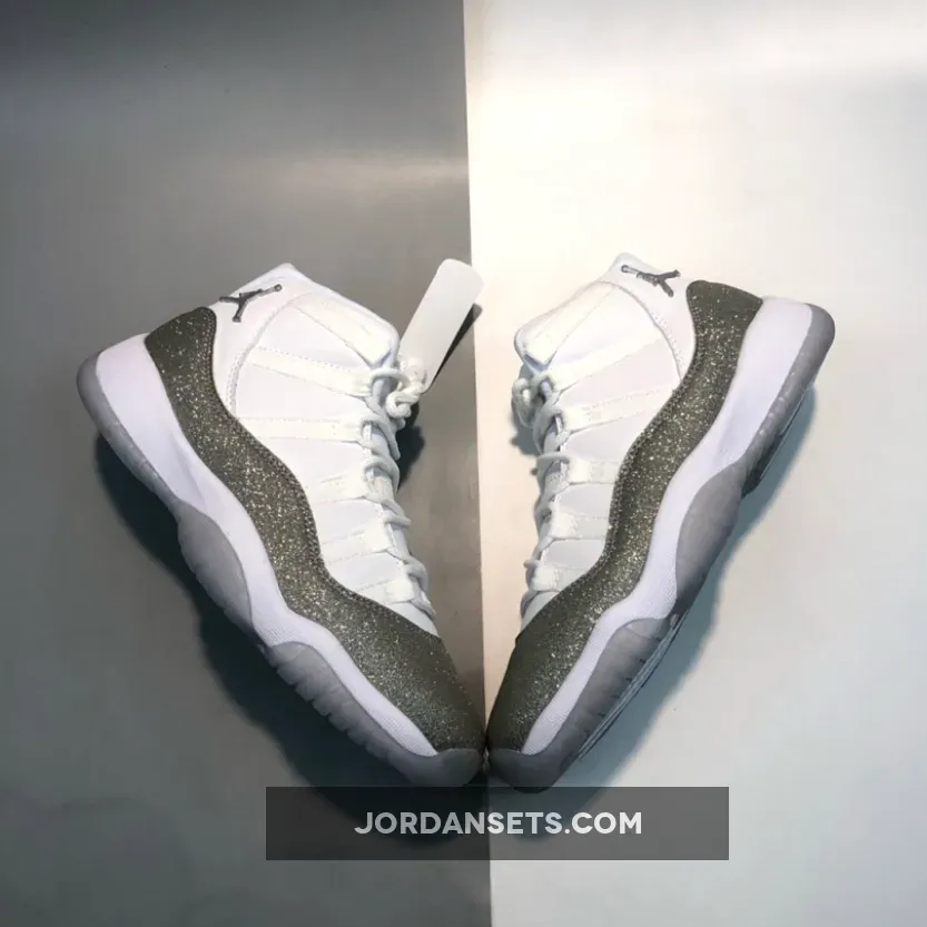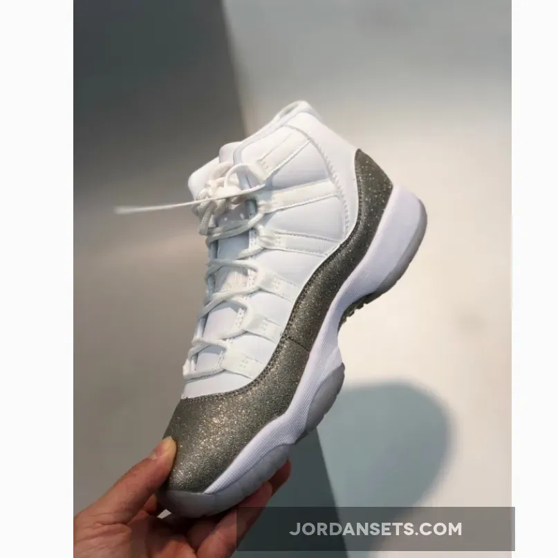 Dressed in a White, Metallic Silver, and Vast Grey color scheme. This Air Jordan 11 features a White upper with a shiny Silver-encrusted finish replacing the traditional glossy patent overlay adding for a nice luxurious touch. A White midsole atop a translucent outsole completes the design.