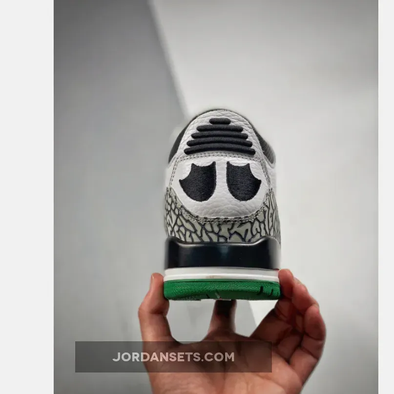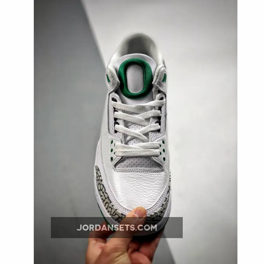After a detailed look at the Oregon “Pit Crew” Air Jordan 3 over the weekend, here’s a closer look at the Oregon “Home” colorway. Inspired by the original “Cement” colorway, the shoe features a white tumbled leather base, accented by grey elephant print overlay rands wrapped around the toebox and heel. Contrasting black hits are used for the laces eyelets, “O” embroidery, tongue padding, collar, duck feet embroidery on the heel and rear portion of the midsole. These were limited to students, athletes, staff and select alumni.