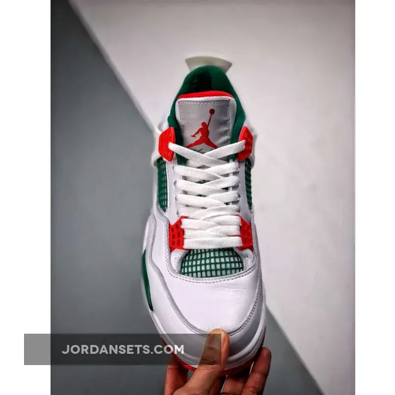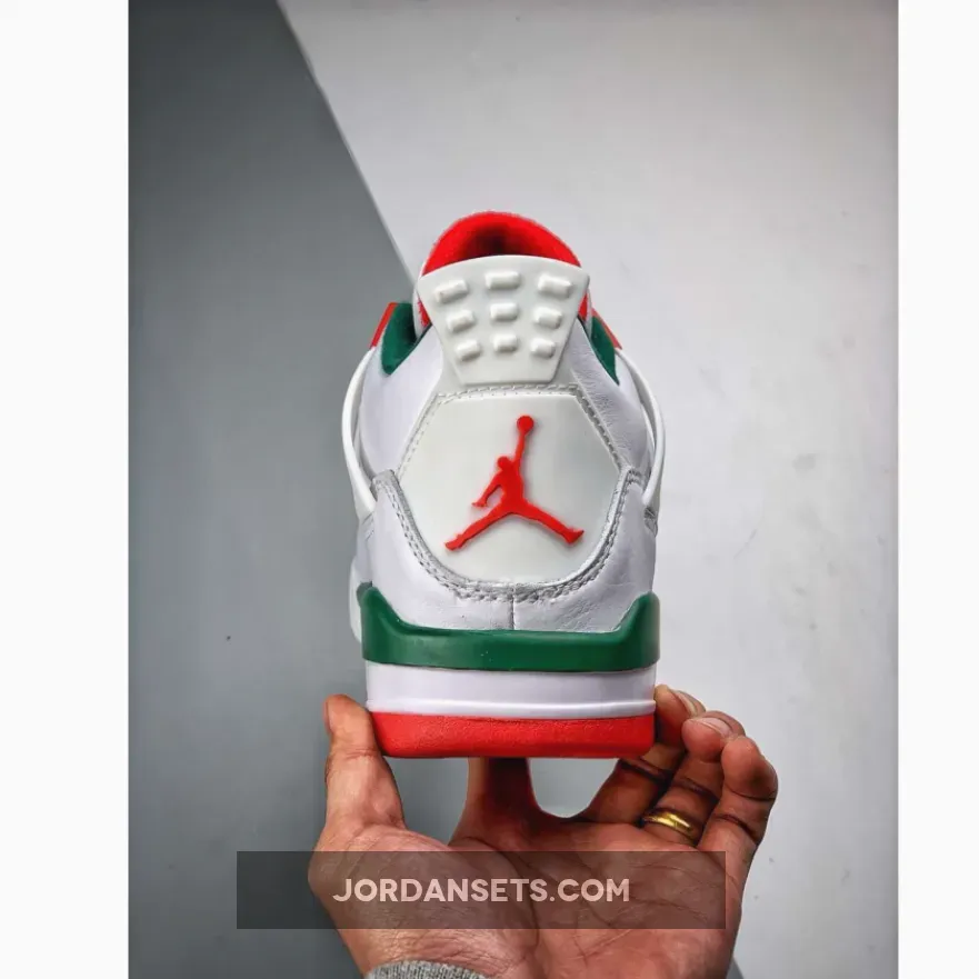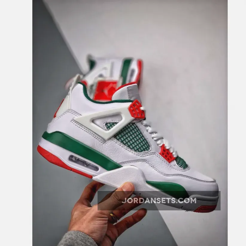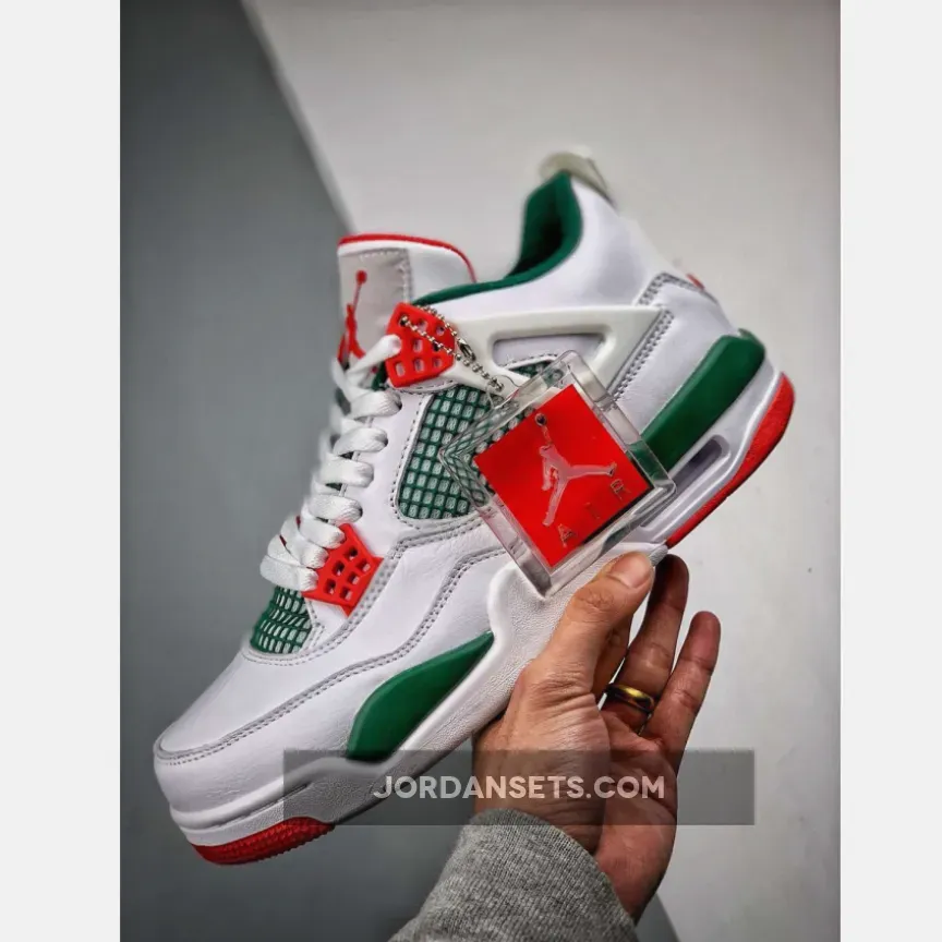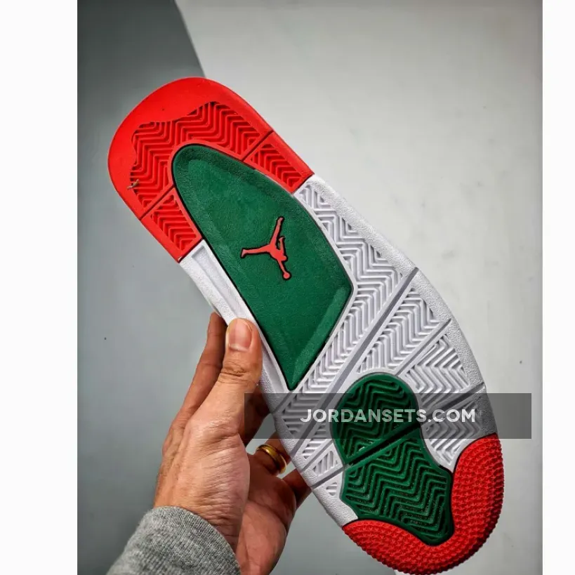 Dressed in a White, Gorge Green, and Varsity Red color scheme. No leaked photos have surfaced, but this Air Jordan 4 is expected to feature a White-based upper with Green and Red contrasting accents.