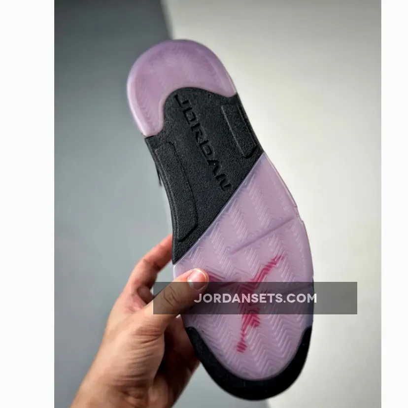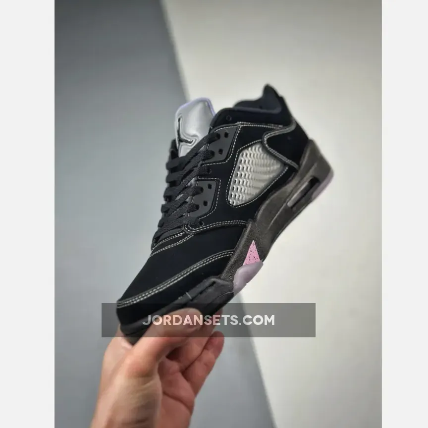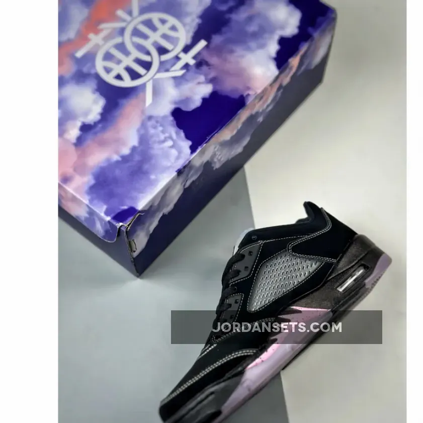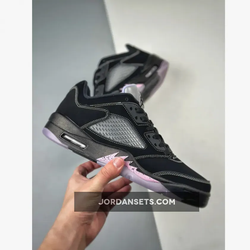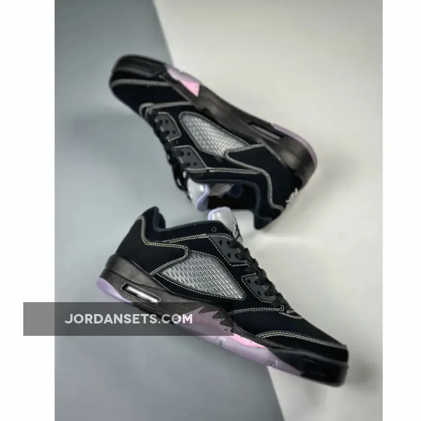 Done in a Black, White, Lilac Ice, and Pink Rise color scheme, this Air Jordan 5 Low comes dressed in a Black nubuck upper decorated with 3M reflective tongues and Pink hits appearing on the speckled shark teeth overlay along the midsole.