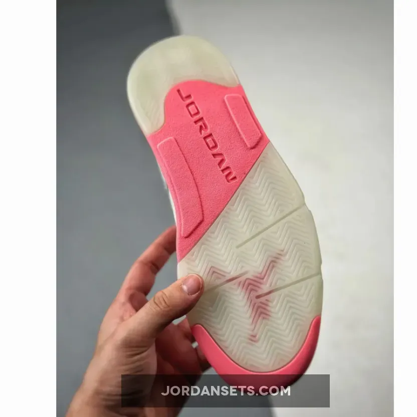 The sneaker uses a white leather upper and tongue with Pink and Desert Berry accenting throughout. Jumpman branding is seen on the tongue and heel with the quarter panel featuring the translucent side netting the AJ5 is known for. Pink and Desert Berry are seen on the midsole as well with a translucent outsole finish off the sneaker.
