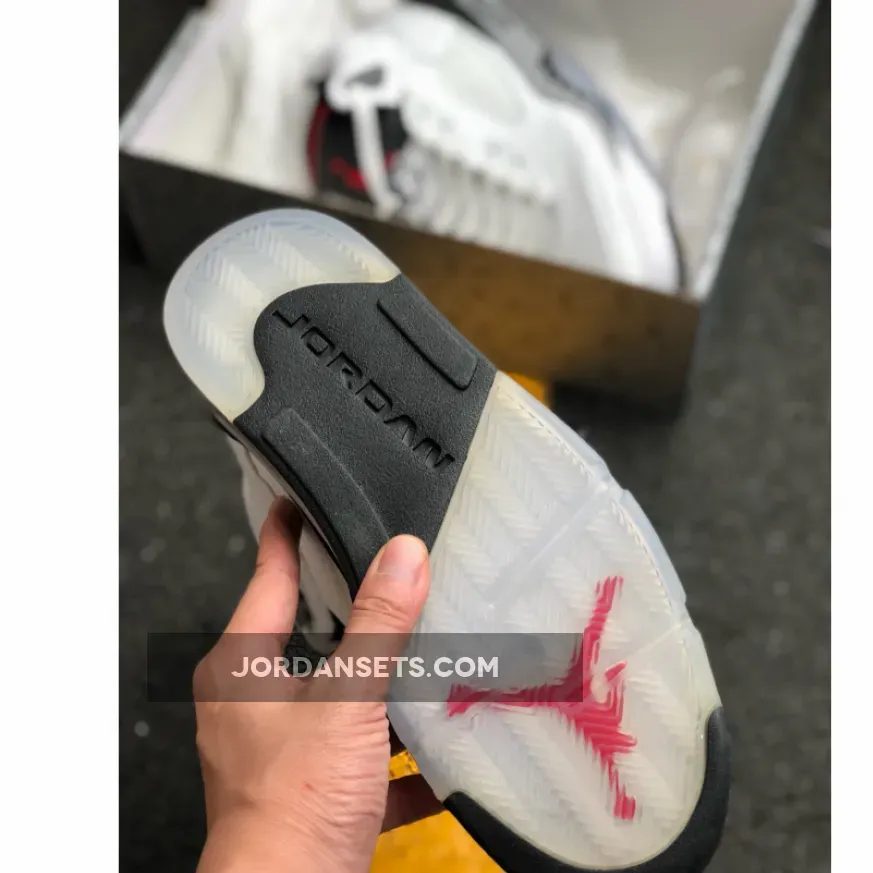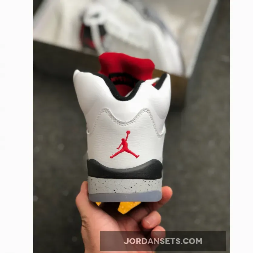 Dressed in a White, Black, Red and Cement Grey color scheme. This Air Jordan 5 features a White leather upper with an Air Jordan 4-inspired Cement print on the upper eyelets and midsole. Its 3M reflective Black tongue resembles the “Fire Red” release, while sitting atop an icy translucent outsole.