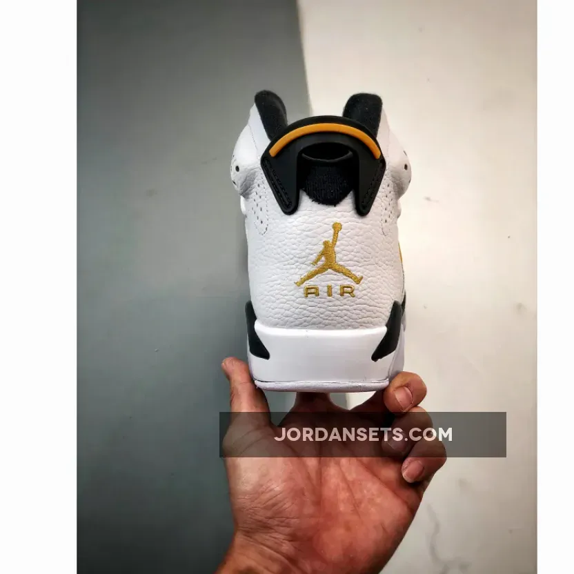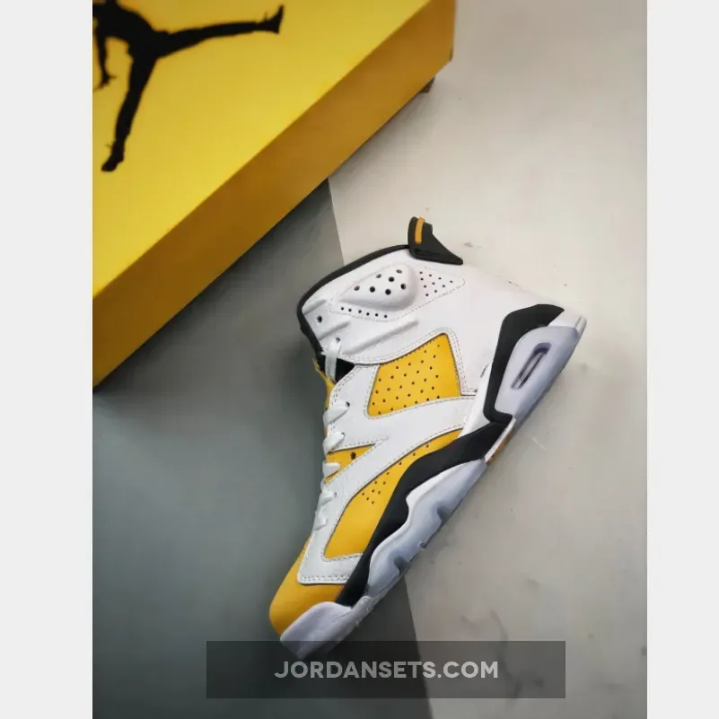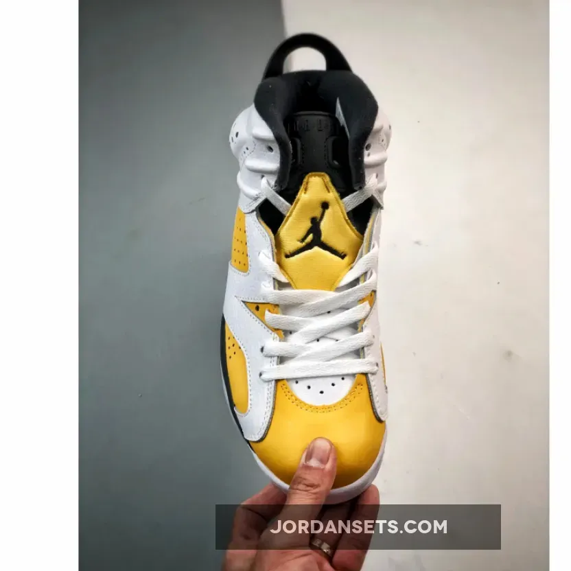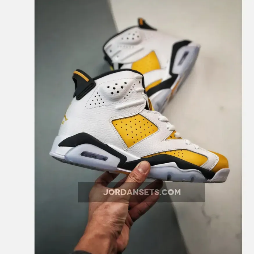 The palette combines White, Yellow Ochre, and Black, reminiscent of the beloved “Carmine” pattern. This iteration of the Air Jordan 6 embraces the iconic “Carmine” layout with White leather overlaying and Yellow Ochre suede on the side panels, toe box, lace locks, heel tab’s section, and tongue overlay. Adding depth, Black accents the tongue, inner lining, Jumpman logo, as well as the heel and midsole spoilers. A crisp White midsole crowns the design, harmonizing with the icy translucent outsole featuring a subtle underfoot Jumpman logo.