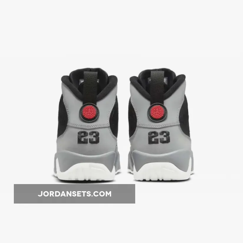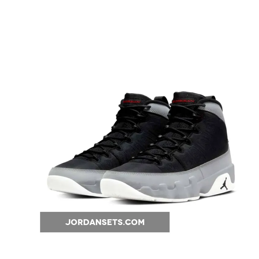 With color blocking similar to the 2014 Air Jordan 9 Barons, the Air Jordan 9 Particle Grey boasts a black nylon upper with quilted panels and light grey Durabuck mudguards. At the heel, a red Jumpman basketball emblem brings a sharp contrast to its neutral base. Nodding to the original Air Jordan 9, a white outsole with embossed graphics and phrases completes the design.