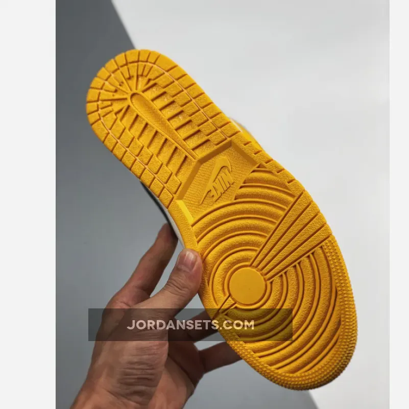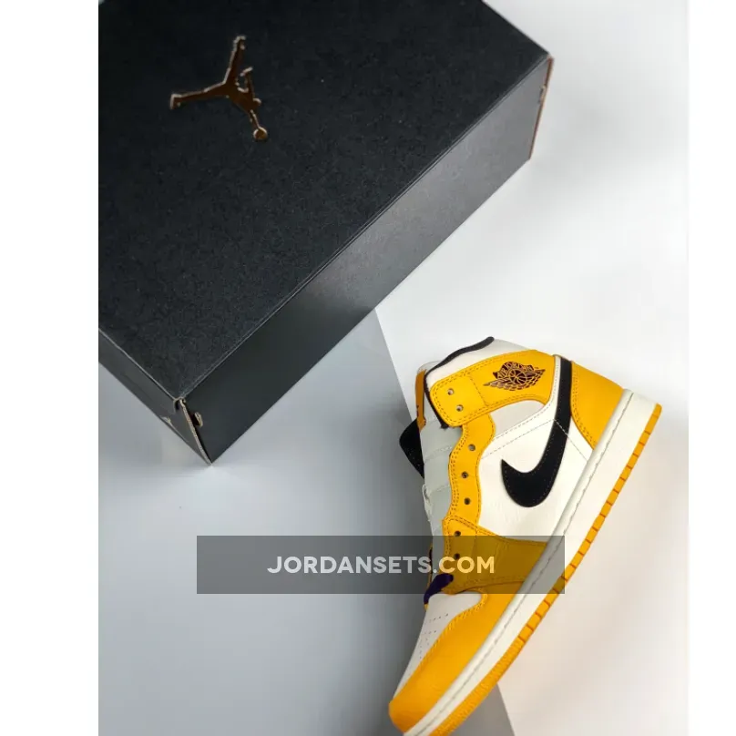 This mid-top iteration of the Air Jordan 1 features a Sail leather underlay with Yellow tumbled leather overlays. Additional details includes a Black Swoosh logo on the sides completed with Purple laces and insoles for that LA Lakers vibe.