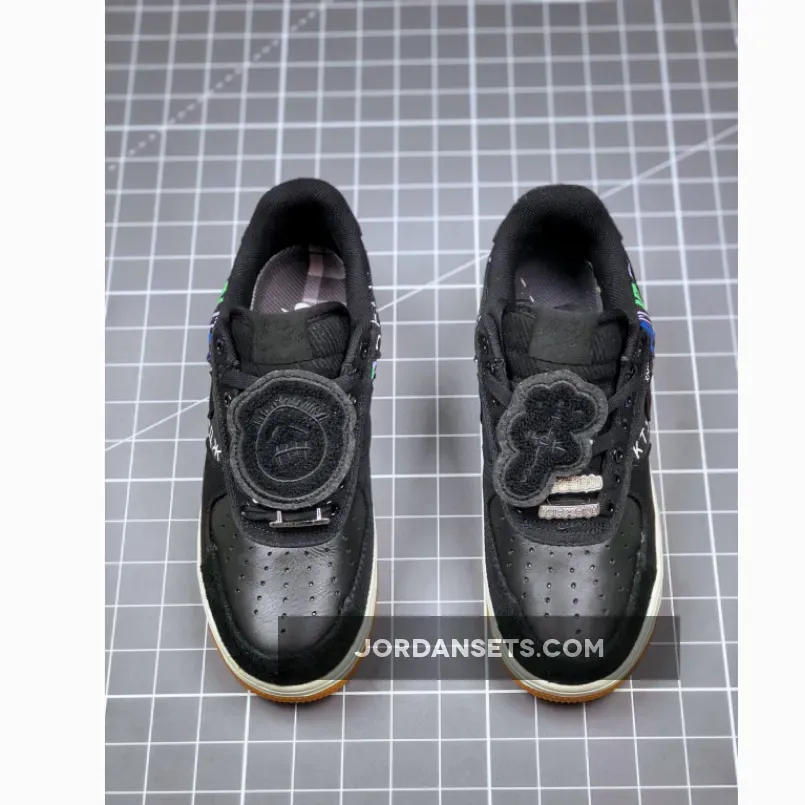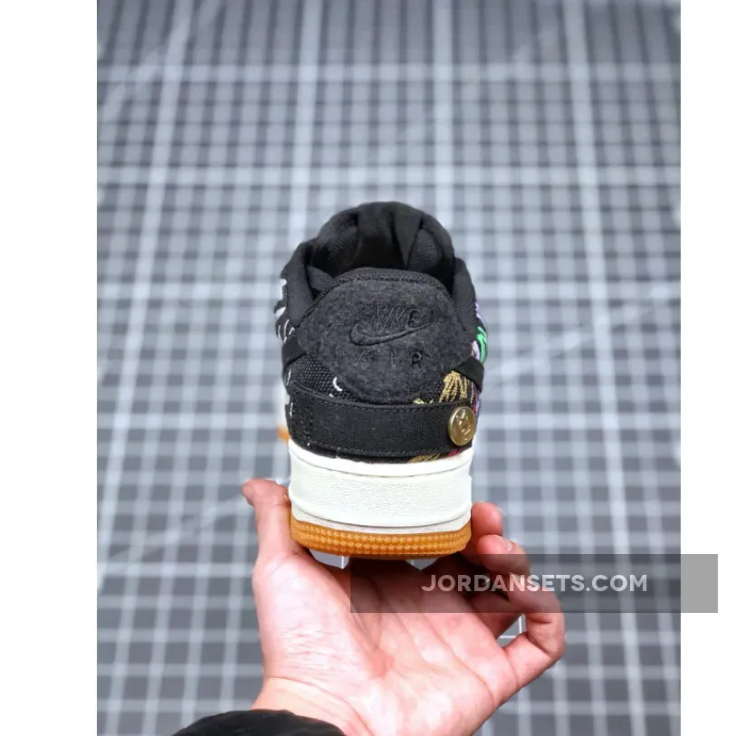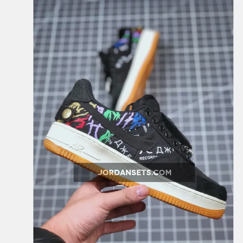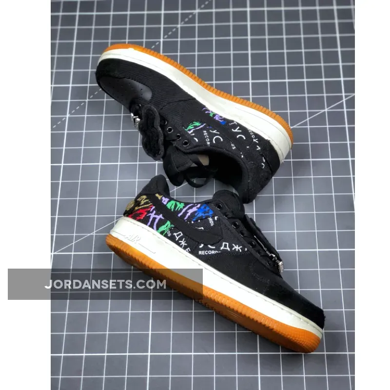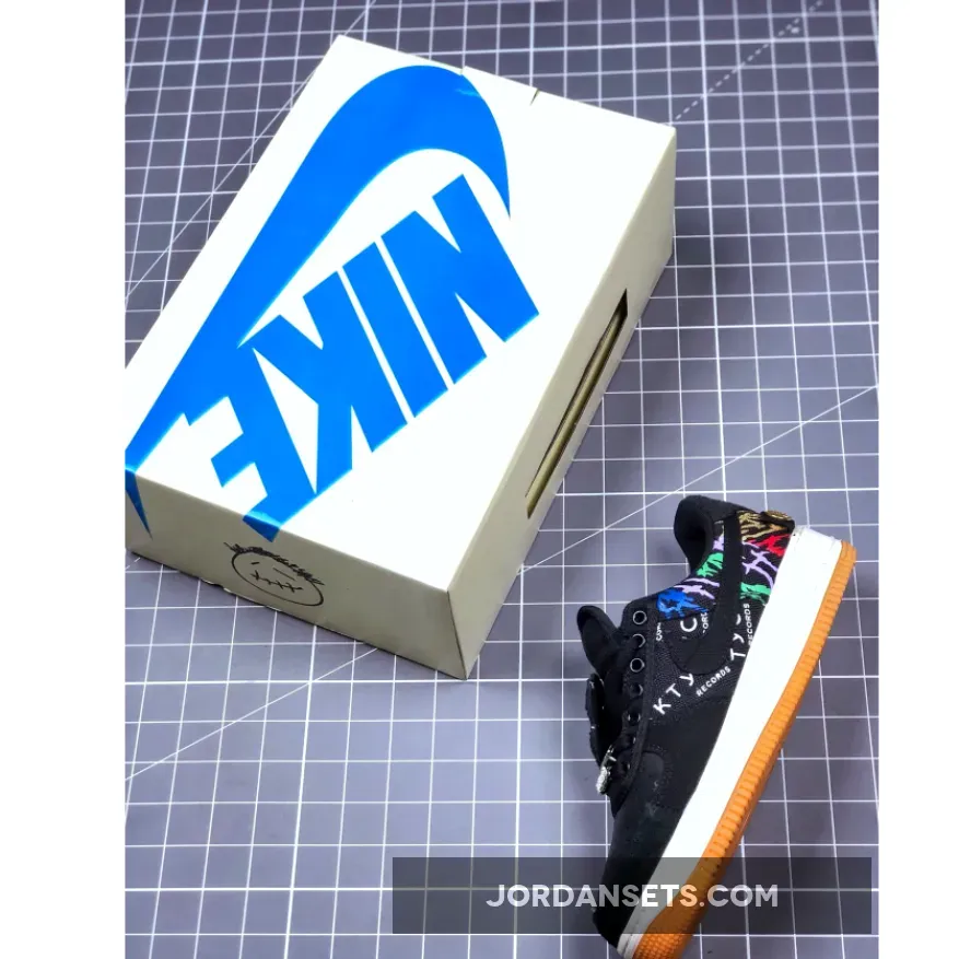Courtesy of sneaker insider @ryivibes, we have a look at a black iteration of the shoe constructed of suede, canvas and leather panels marked with “Cactus Jack” printing and abstract patterns, this time done in an array of colors. The shoe also comes with matching canvas straps at the rear held down by gold-tone buttons but the corduroy/canvas sheath covering the tongue has been replaced by grill-inspired lace dubrae and interchangeable tongue patches. Rounding up the design of the alternate take is a white midsole paired with a gum rubber outsole.