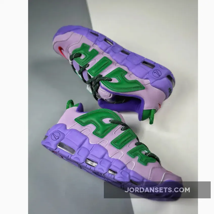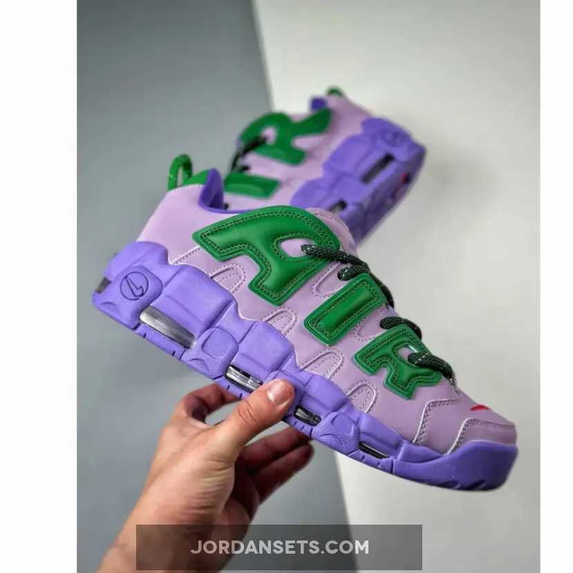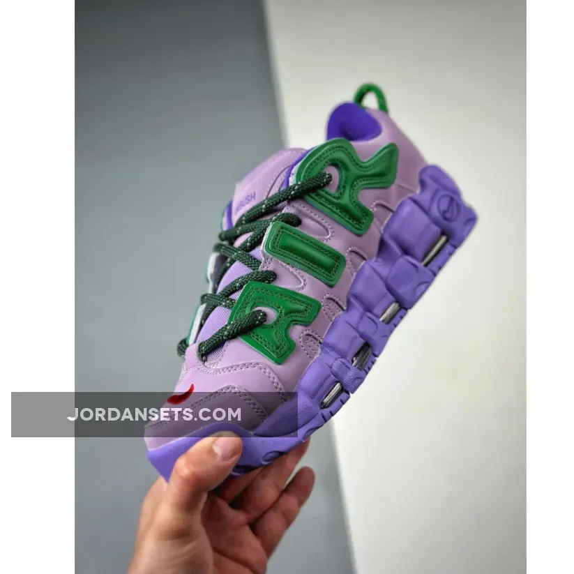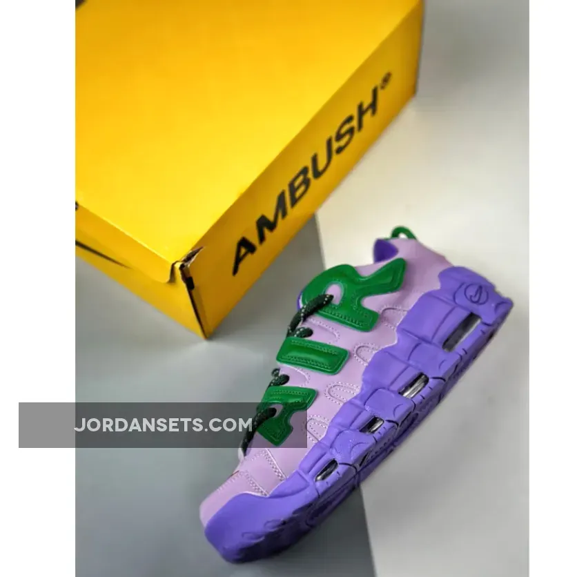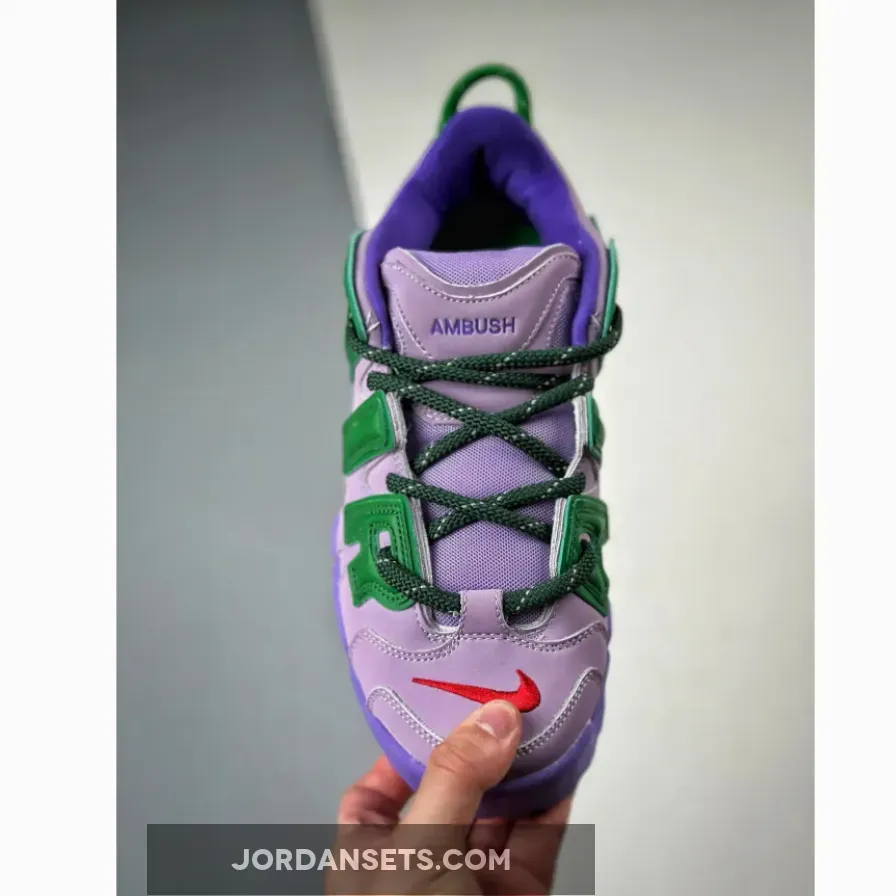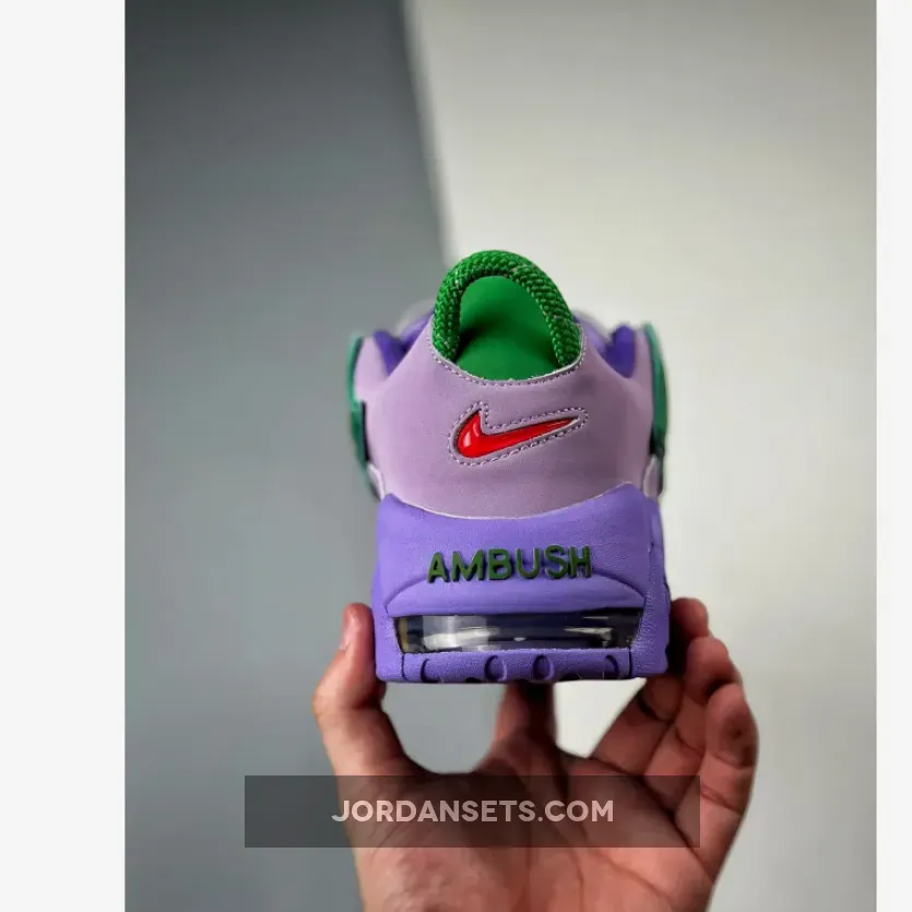 Adorned in a captivating color palette comprising Lilac, Apple Green, University Red, and Team Green, this Ambush x Nike Air More Uptempo Low variant boasts a predominantly Lilac upper that is accentuated by vibrant Green “AIR” lettering emblazoned on the sides, complemented by rope laces, back heel pull tabs, and “AMBSUH” branding gracefully showcased on the heels. The toe box and heels feature University Red Swooshes alongside prominent “AMBUSH” branding on the tongues, while the purple inner lining exudes a luxurious feel. Notably, the shoe will be available in men’s sizes, catering to a diverse range of preferences.
