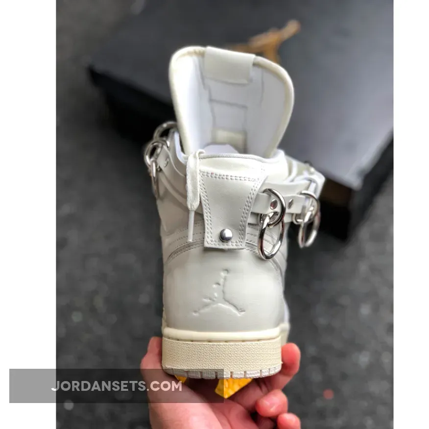 Unveiled at the Fall/Winter 2019 show, the Comme des Garçons x Air Jordan 1 Retro Strap High elevates the icon with a punk-inspired aesthetic and luxury elements. This edition features a white leather upper with studded eyerows, an exaggerated tongue and debossed branding. A buckled strap with O-rings circles the ankle. The Air-assisted midsole and pivot point rubber outsole retain the sneaker’s classic functionality.