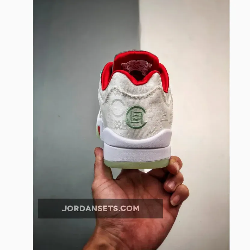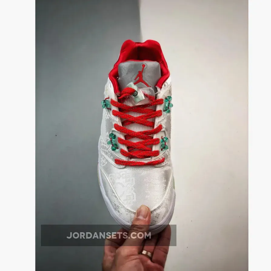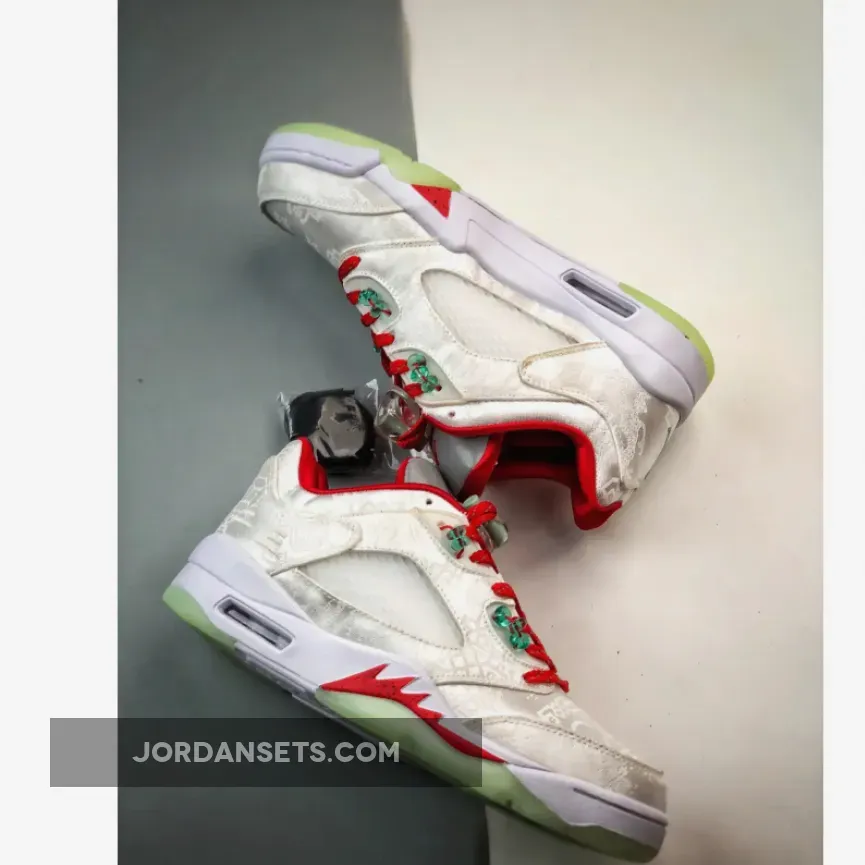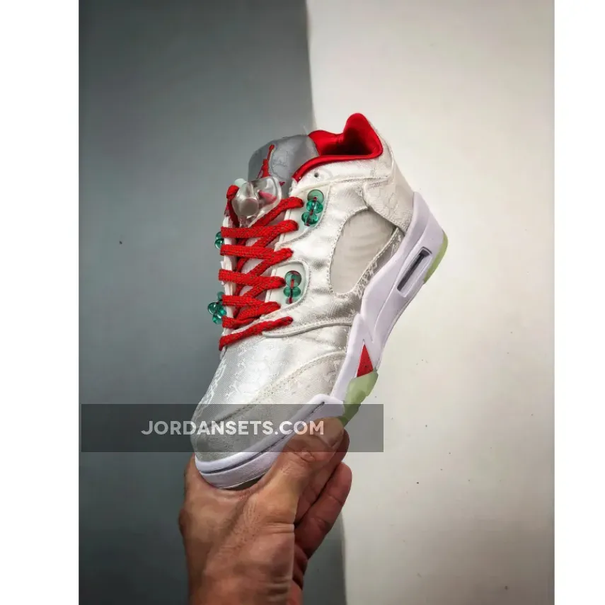 CLOT’s dedication to precision shines in this Air Jordan 5 Low. It retains original features but ditches the black base for an elegant white silk finish. The entire upper boasts meticulously embroidered Chinese characters, proudly showcasing CLOT branding at the back heel. Adding flair are vivid red accents on the laces, Jumpman logos, and sockliner.