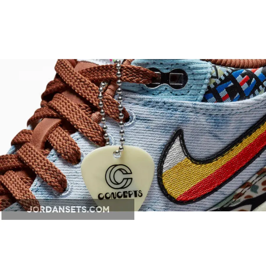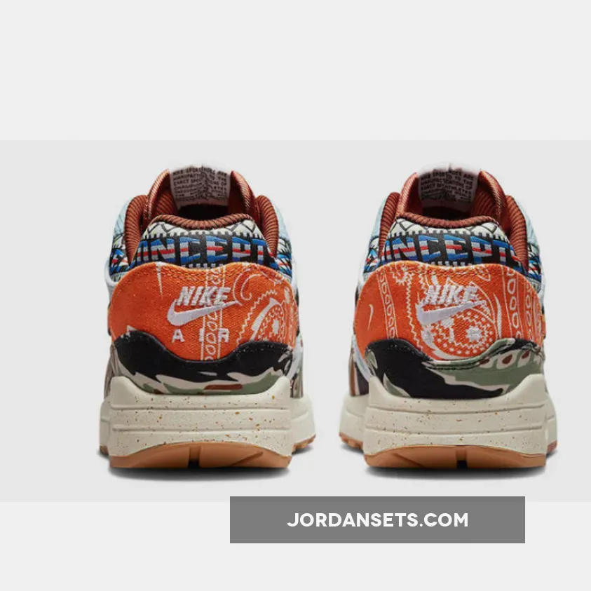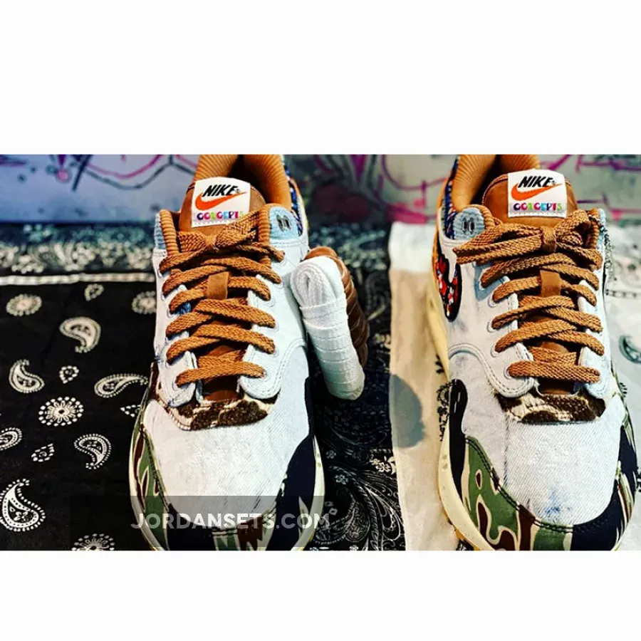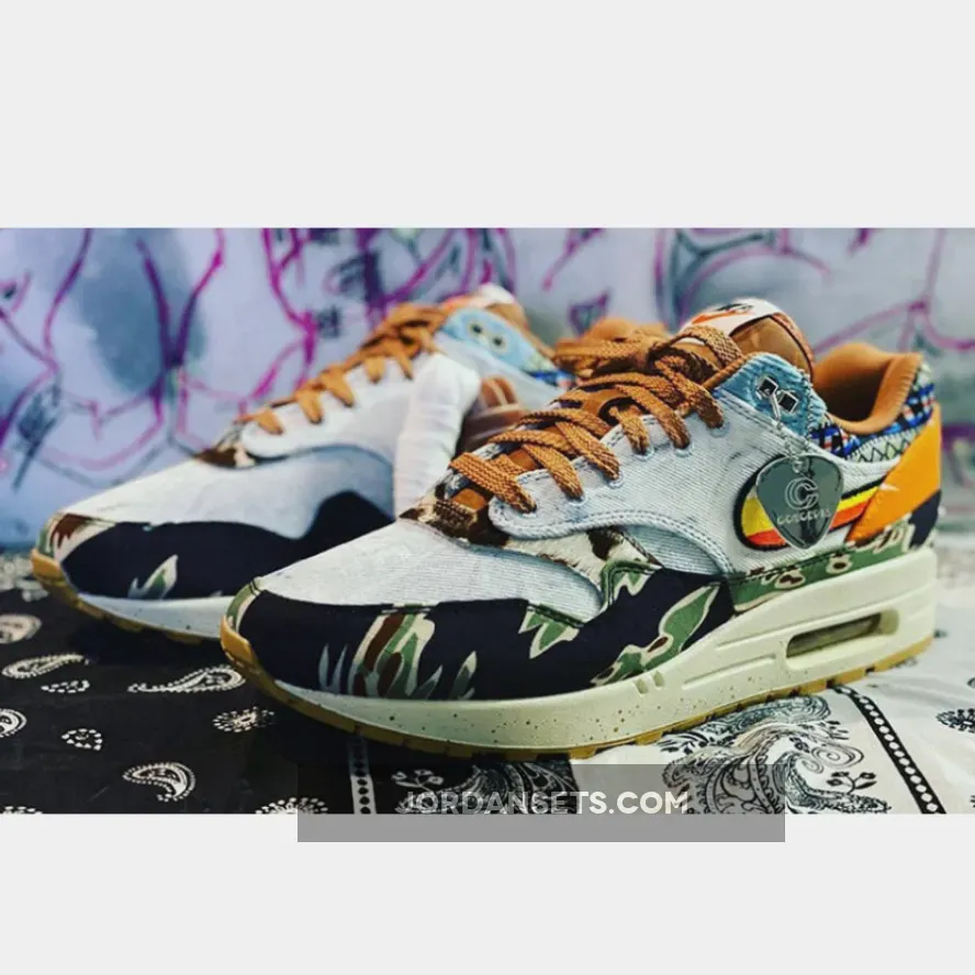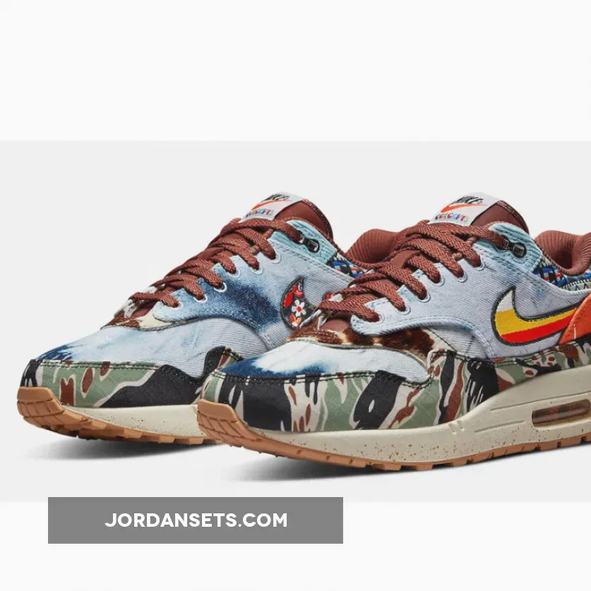 The Concepts x Nike Air Max 1 “Heavy” celebrates the iconic AM1 silhouette’s 35th anniversary by paying homage to 60s and 70s inspired design cues. Also referred to as the Air Max 1 “Denim Tiger Camo” due to the shoes mismatched and psychedelic upper, there is a lot to unpack with this sneaker.Panels of denim, tiger print, tie-dye, camo, bandana print, and a floral swoosh are all present on this collaboration. There are also incredible details throughout this shoe such as embroidery and nods to both Concepts and the Swoosh brand. Paying homage to the music of the period, the “Far Out” sneaker even comes with a hang tag in the shape of a guitar pick.