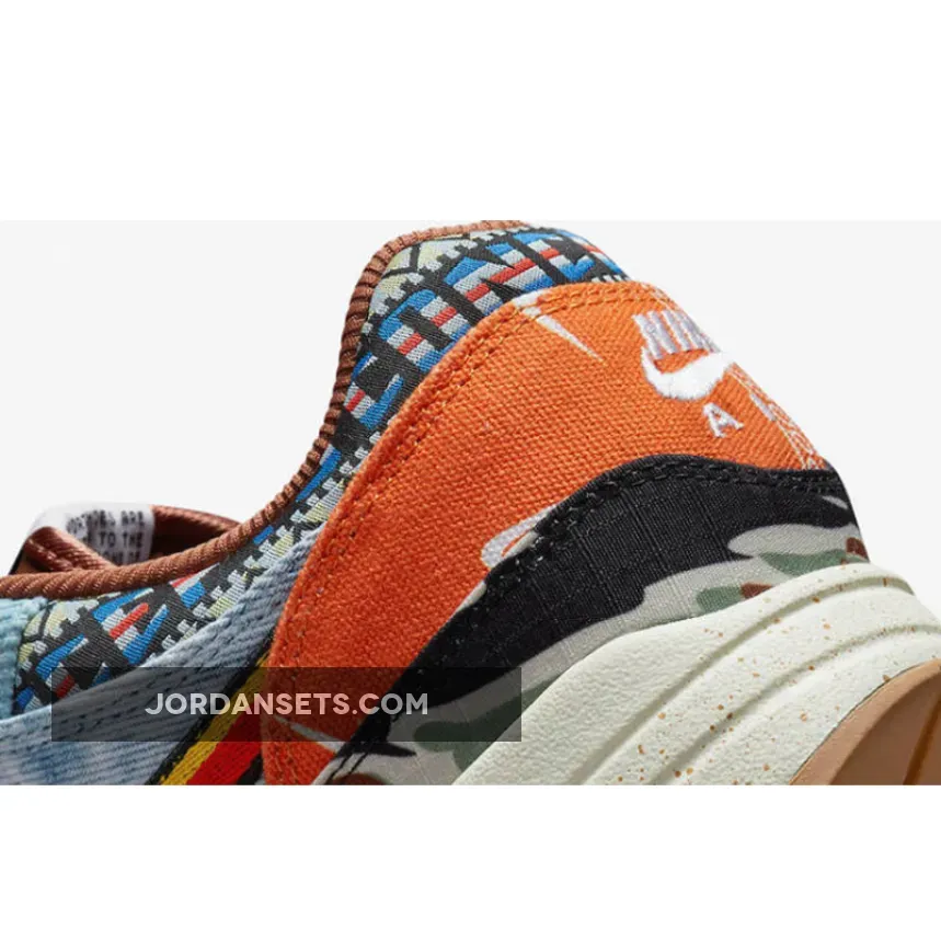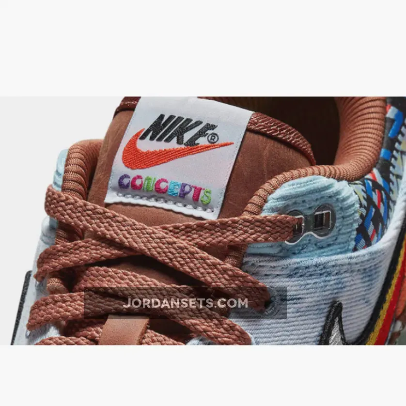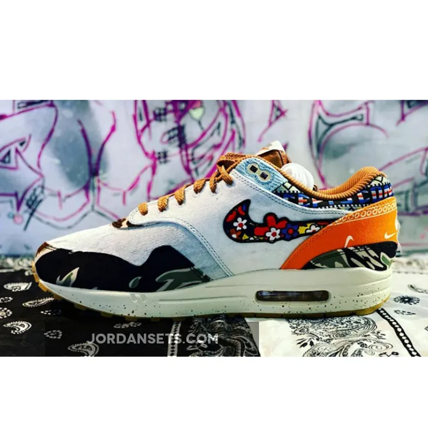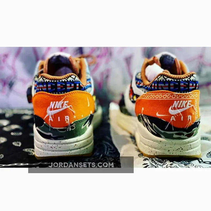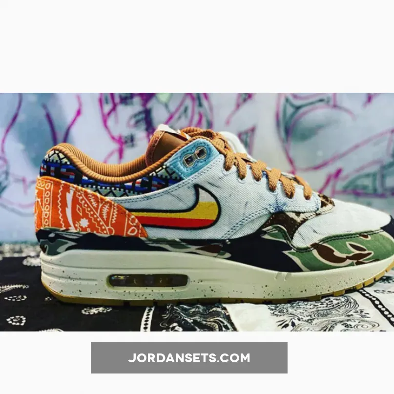 The Concepts x Nike Air Max 1 “Heavy” celebrates the iconic AM1 silhouette’s 35th anniversary by paying homage to 60s and 70s inspired design cues. Also referred to as the Air Max 1 “Denim Tiger Camo” due to the shoes mismatched and psychedelic upper, there is a lot to unpack with this sneaker.Panels of denim, tiger print, tie-dye, camo, bandana print, and a floral swoosh are all present on this collaboration. There are also incredible details throughout this shoe such as embroidery and nods to both Concepts and the Swoosh brand. Paying homage to the music of the period, the “Far Out” sneaker even comes with a hang tag in the shape of a guitar pick.