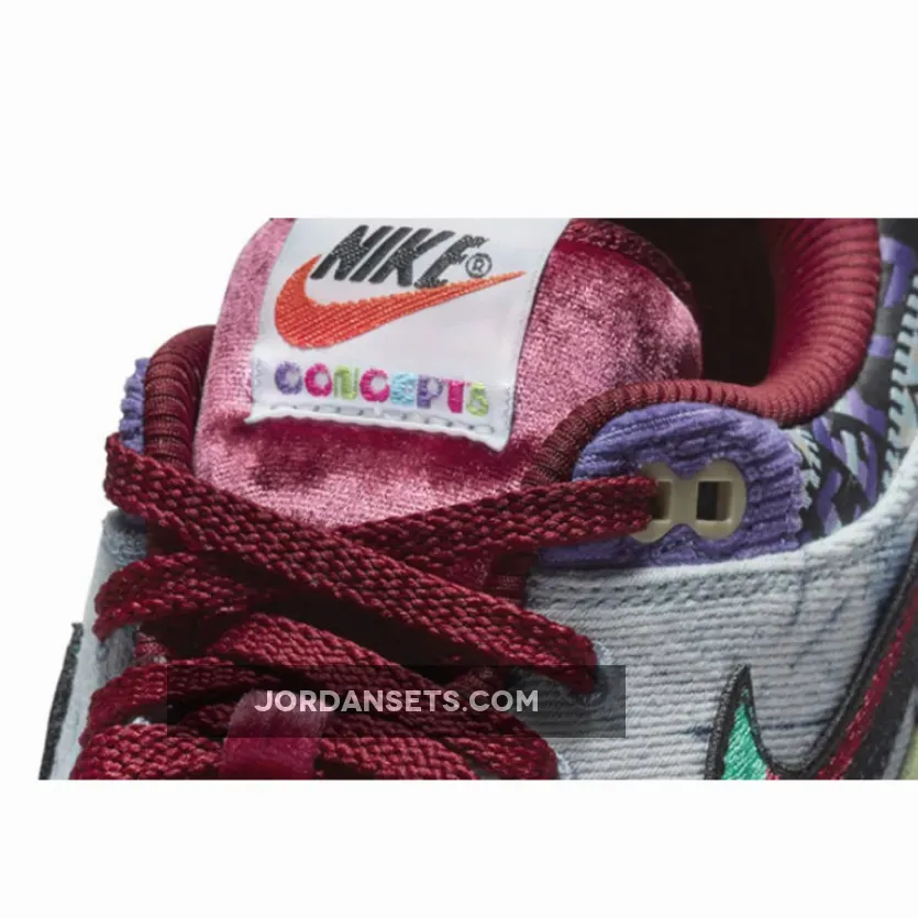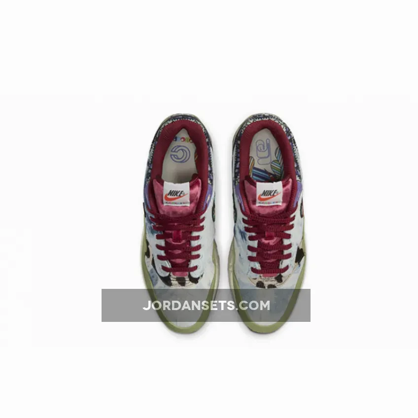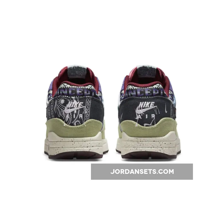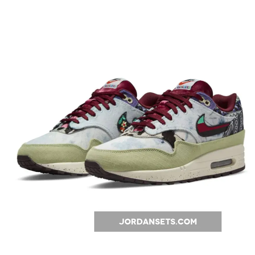 Concepts has officially begun unveiling their upcoming Nike Air Max 1 Collection, which celebrates the 35th anniversary of the iconic silhouette. The collaboration is officially dubbed the Concepts x Nike Air Max 1 SP “Mellow” Collection. “Nike has been a tremendous partner to Concepts. Together, our collaborative track record speaks for itself,” says Deon Point, Concepts Creative Director. “When we decided to work on the Air Max 1, a personal favorite, we wanted to fully honor the irreverent spirit of Nike from its origins in the ‘60s up to today.” This idea is paid off through the Concepts x Nike Air Max 1 SP “Mellow.” The design digs into the culture, music and style of the late ‘60s, specifically the music festival scene of the era, in all its vibrancy. Often held over long weekends, these festivals ticketed by the day. And, while there was a shared belief in the peaceful power of the gatherings, each had its own unique essence. The music was eclectic, the style electric, and mood buoyed by crowds spreading love. Among the festival goers were seen protest symbols, peace signs, floral adornments and frayed edges. Denim mixed with the now familiar olive of military surplus M-65s, and juxtaposed with the softness of wide wale corduroy and velvet. These elements give the Nike x Concepts Air Max 1 SP “Mellow” its character. The shoe’s motifs draw from the 1969 summer music series that took place in Harlem with an olive green mudguard, in homage to the M-65. The “Friday” colorway includes patterned elements of bandanna, cowhide, and woven material panels. The former, a Concepts-exclusive, approximates the famous guitar straps of the era. Further details include a lateral striped Swoosh and a medial “flower power” Swoosh. The tongue label revives a classic ‘70s Nike logo and twists it with a Concepts “hippie” word mark. The design is completed by a custom footbed.
