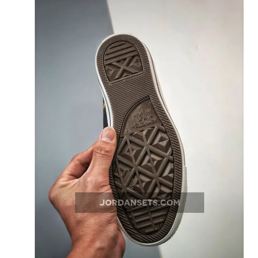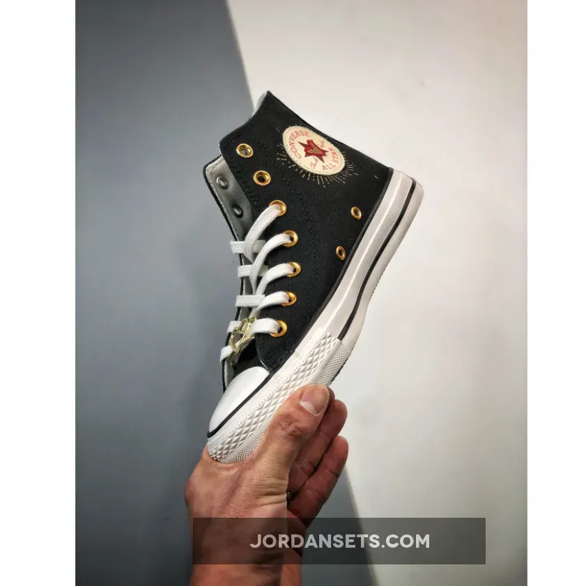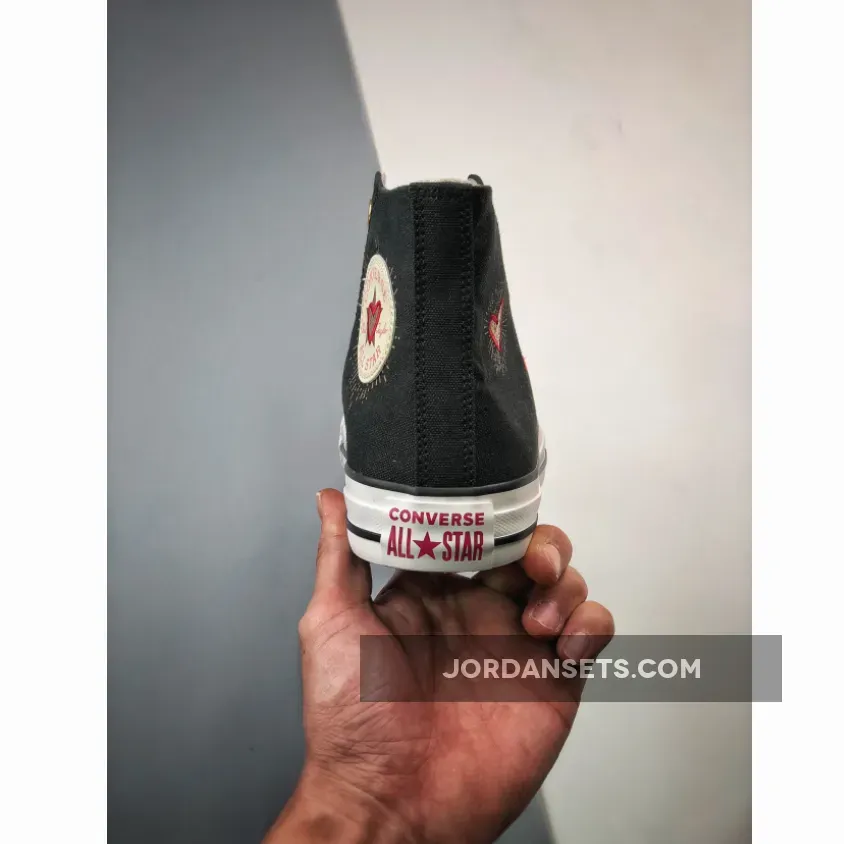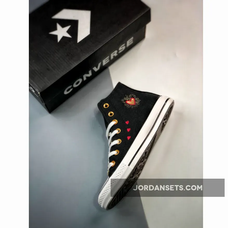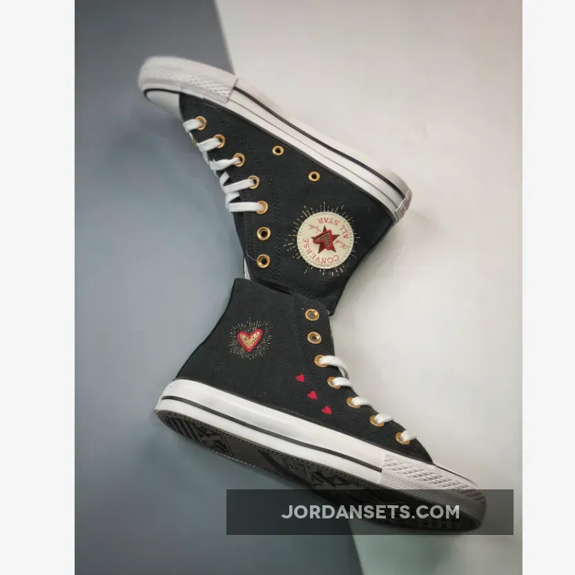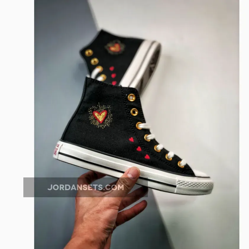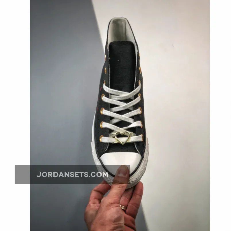 Converse’s OG classic, the Chuck Taylor, joins the brand’s Valentine’s Day Pack. Meet the Converse Chuck Taylor High Hearts Black. This high-top Chuck Taylor has a breathable cotton canvas upper in black. Metallic gold eyelets and metallic gold heart lace deubrés give the shoe a festive feel. Tiny Back Ally Brick-coloured embroidered hearts adorn the lateral side of the shoe along with a bigger gold foil heart with a red embroidered outline. The medial All Star ankle patches have light pink Converse branding and a gold star with a gold heart with a red embroidered outline layered over it.