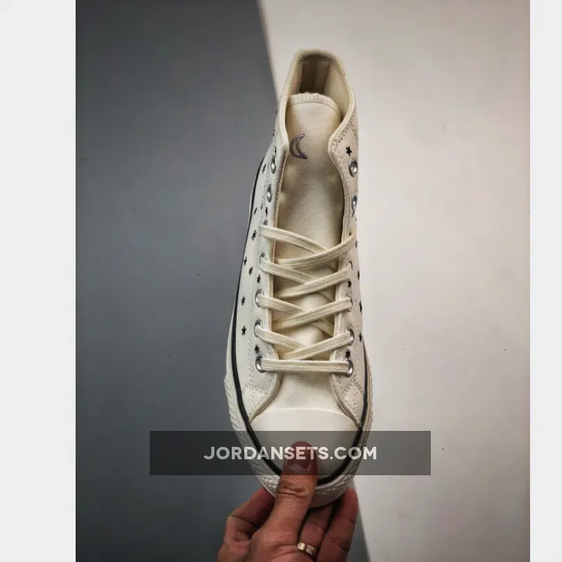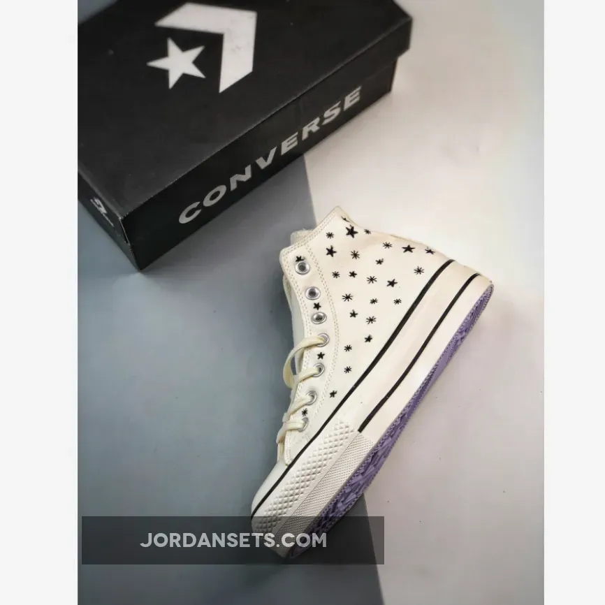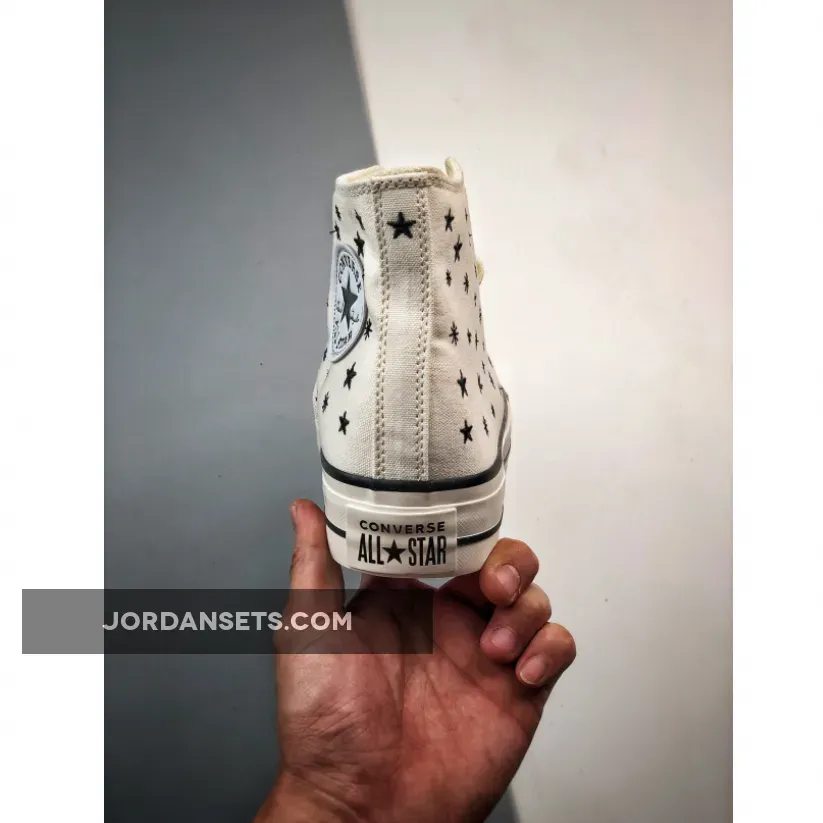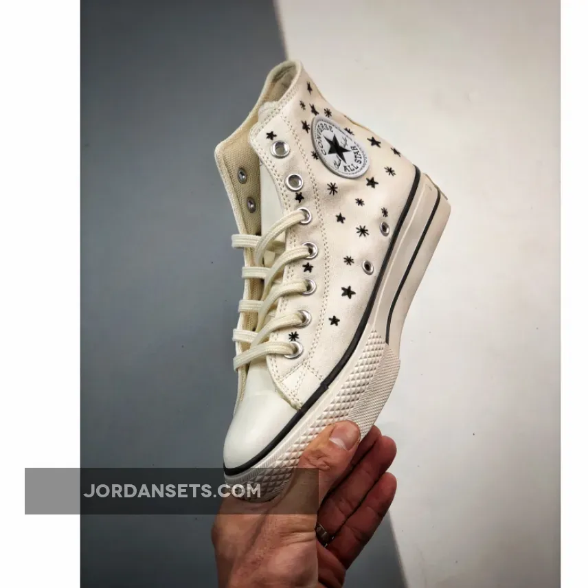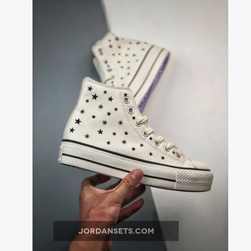 The newest head-turning Converse Chuck Taylor Lift will get you counting your lucky stars. Check out the Converse Chuck Taylor Lift Crystal Energy High Egret. This high-cut Chuck Taylor Lift has an Egret-coloured canvas upper with embroidered black stars scattered all over. Just like other Chucks, this shoe sports the iconic star ankle patch on the medial side and black-and-white Converse All Star rubber heel patches. A white rubber toe cap and a white diamond-patterned toe bumper cap off the style of these kicks.