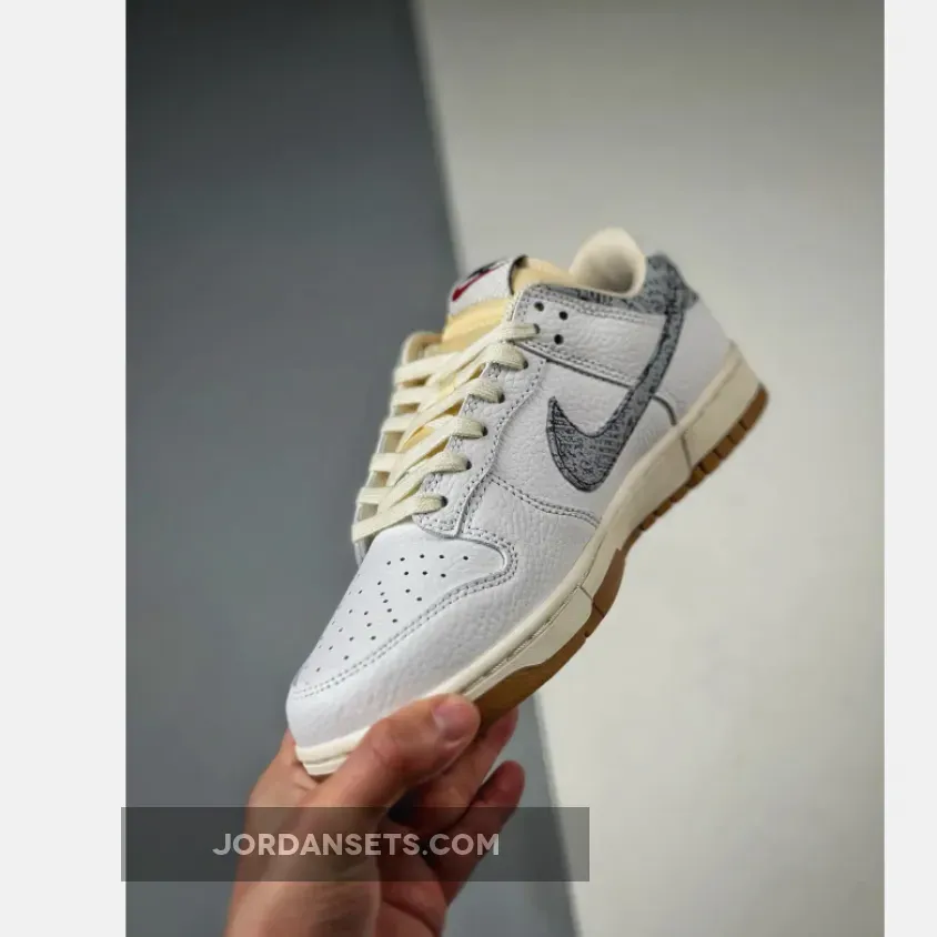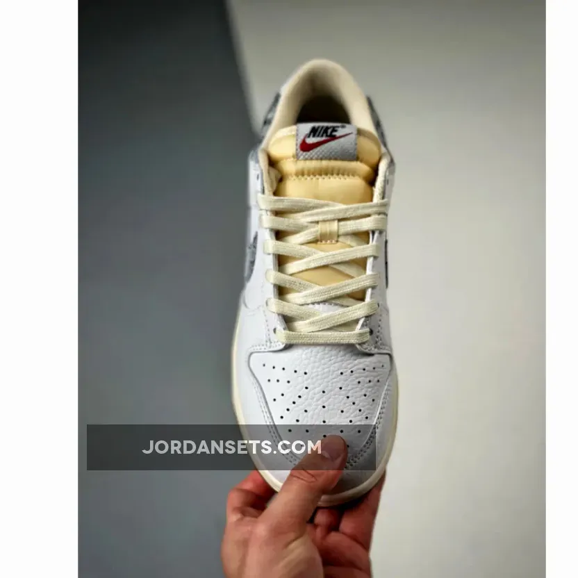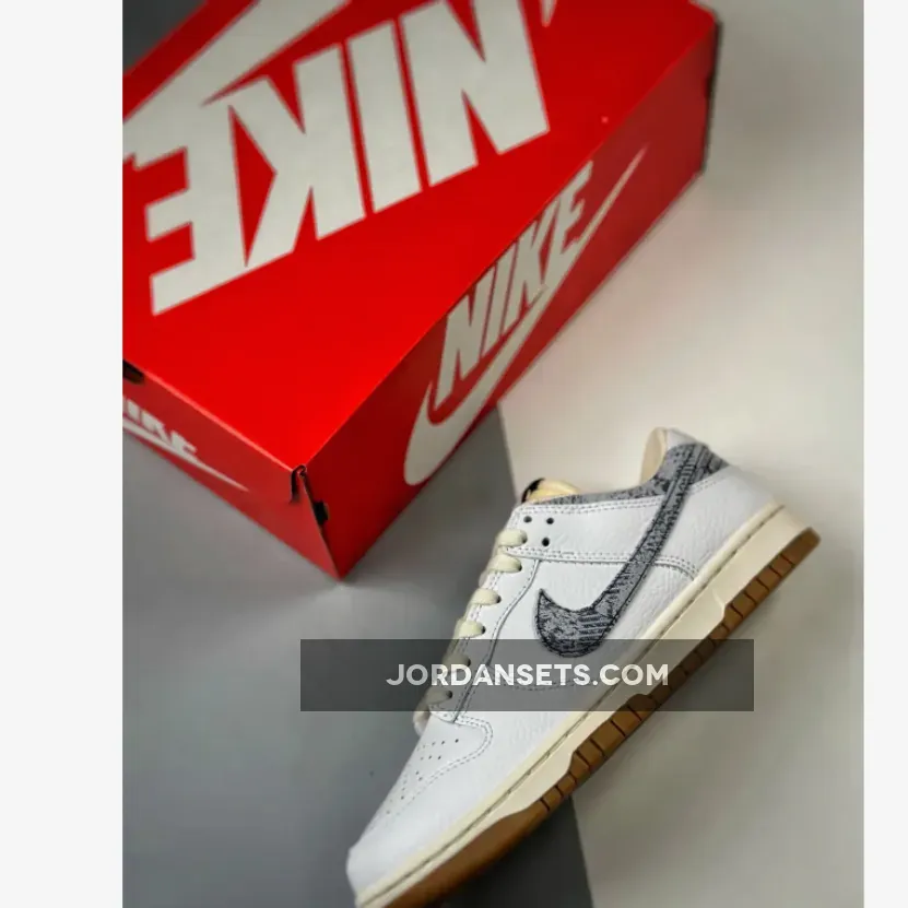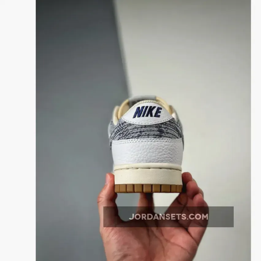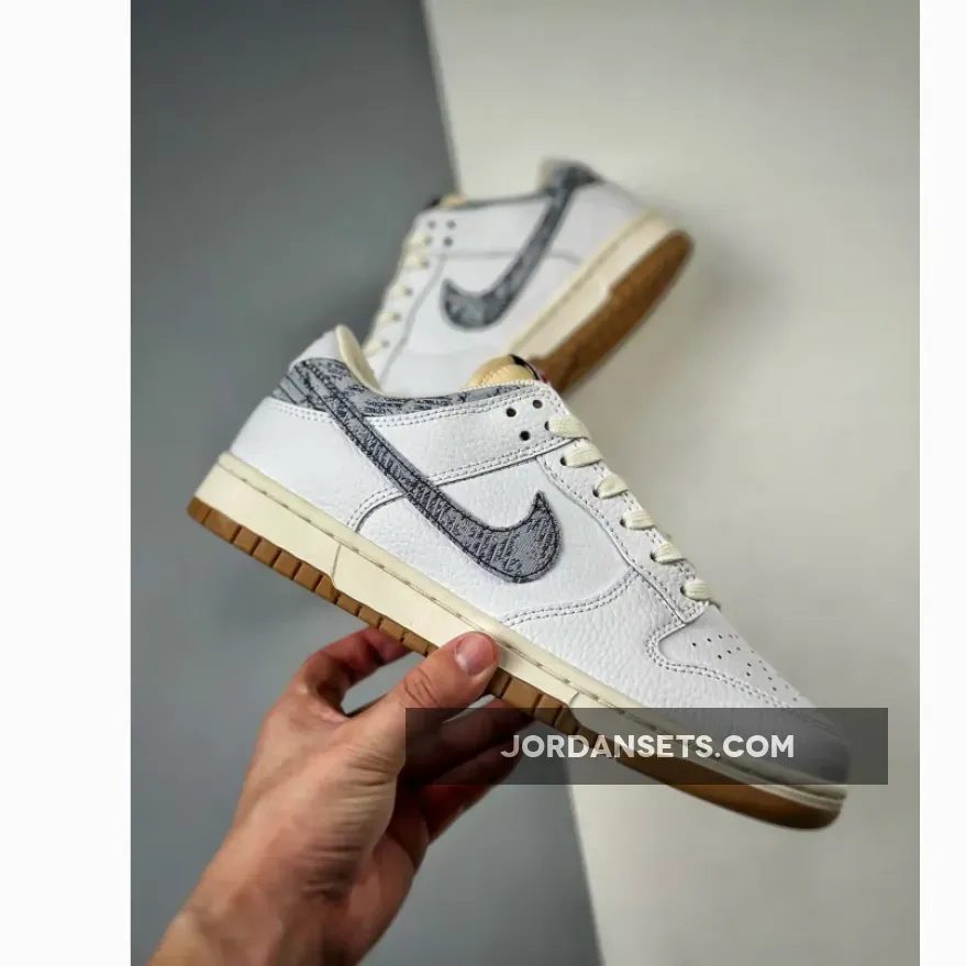 This iteration of the fan-favorite Dunk Low is given a White tumbled leather upper and heel tabs paired up with the aged nylon tongues and mesh inner lining. The highlight of the shoe comes in the form of the faded black and white denim texture applied on the signature profile Swooshes on both the medial and lateral quarter panels and the cut-out collar underlays. The white heel tabs feature “NIKE” text branding embroidered in navy.