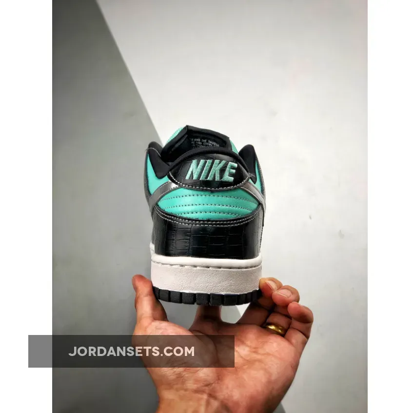 Dressed in crocodile embossed leather with vibrant Blue-like panels, Tershay described his SB Dunk as the most hyped and luxurious shoe at the time. Contrasting with the black crocodile and blue panels is a metallic silver Swoosh. The tongue-tag also features the Diamond Supply Co. diamond logo. A White midsole atop a Black rubber outsole completes the design.