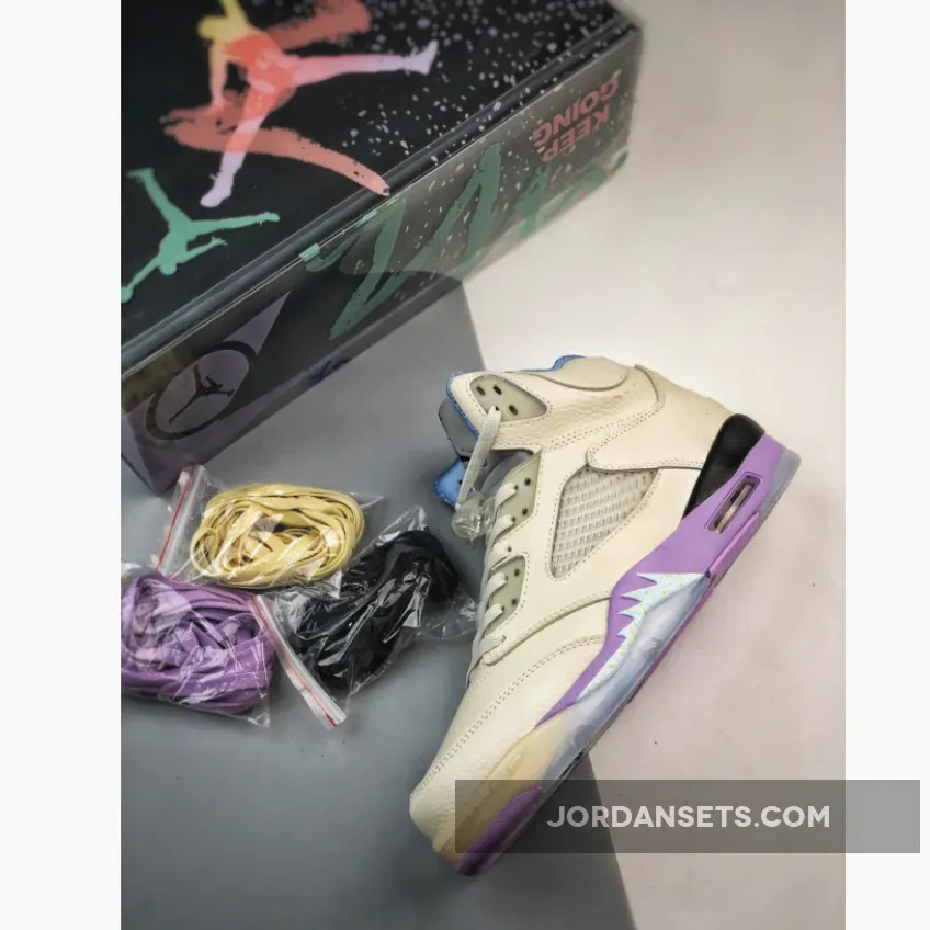 Matching its accompanying colorways, the “Sail” look features a leather upper in its signature color with the Air Jordan 5’s traditional mesh window at the midfoot. Its reflective tongue appears in an eye-catching metallic silver with the Jumpman logo in black. The use of positive affirmations conclude in an upside down fashion reading “KEEP GOING” along the baby blue quilted textile of the tongue’s interior and sock liner.Along the heel tab “WE THE BEST” comes embroidered in a muted yellow finish while rendering a color-match along its semi-translucent lace lock. Completing the look, its sole unit utilizes several of the collection’s key colors including lavender, sky blue and a translucent gum.