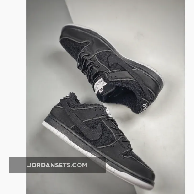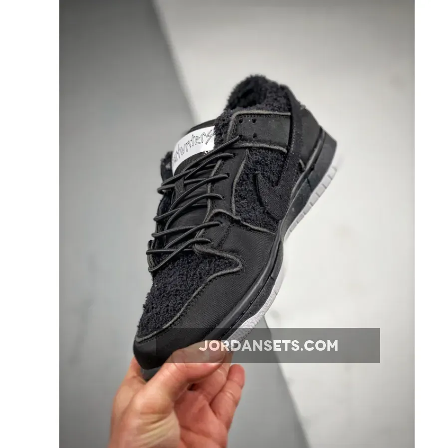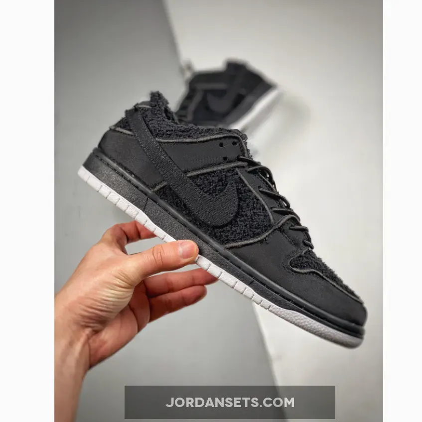 In collaboration with Elissa Steamers surf and skate brand Gnarhunters, the Nike SB Dunk Low Gnarhunters features a all-black terry cloth and padded nylon construction with removable velcro Swooshes and bungee style cord laces. Gnarhunters taped tongue labels add a DIY feel to the design. From there, a black and light grey Zoom Air sole adds the finishing touch.