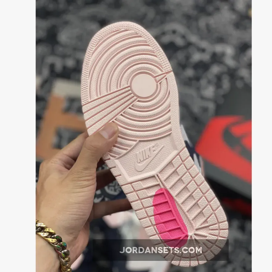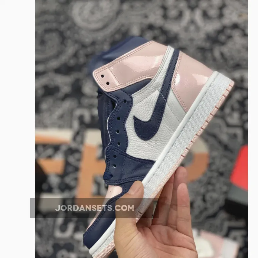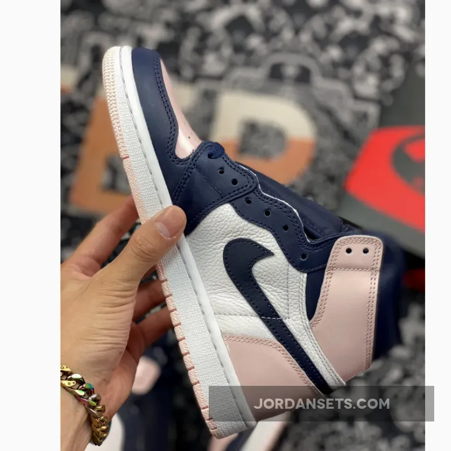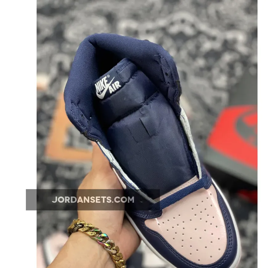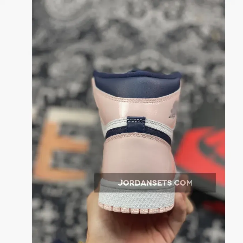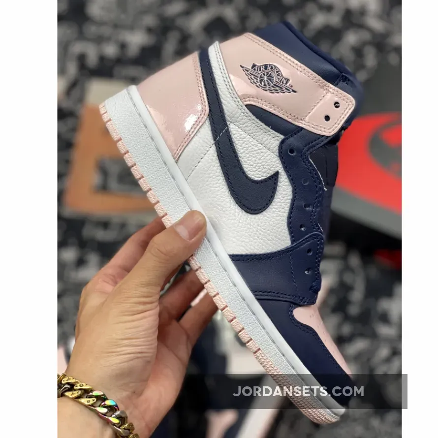 The womens Air Jordan 1 High Atmosphere follows the classic Black Toe color blocking format with a white and dark navy leather upper. Light pink patent leather on the ankle and vamp nods to the pink bubblegum that Michael Jordan chewed throughout his time on the hardwood. Woven Nike tongue labels and a signature Jordan Wings logo draw inspiration from the original 1985 Jordan 1 design.