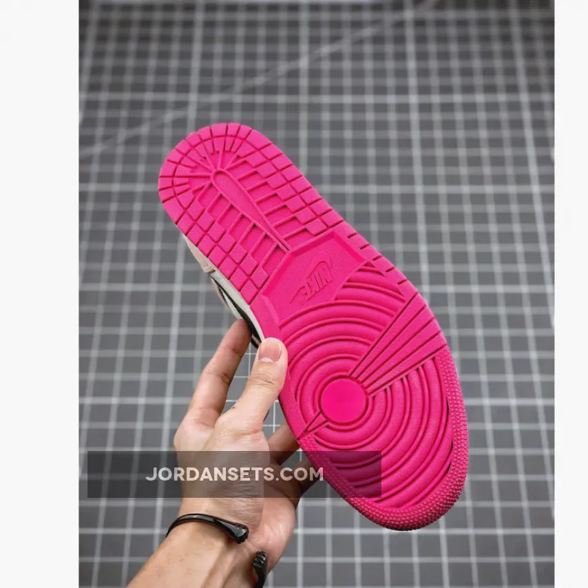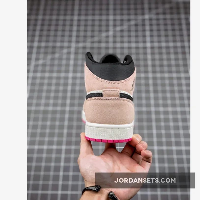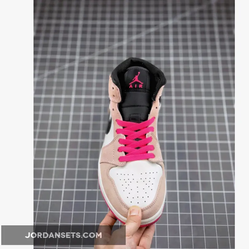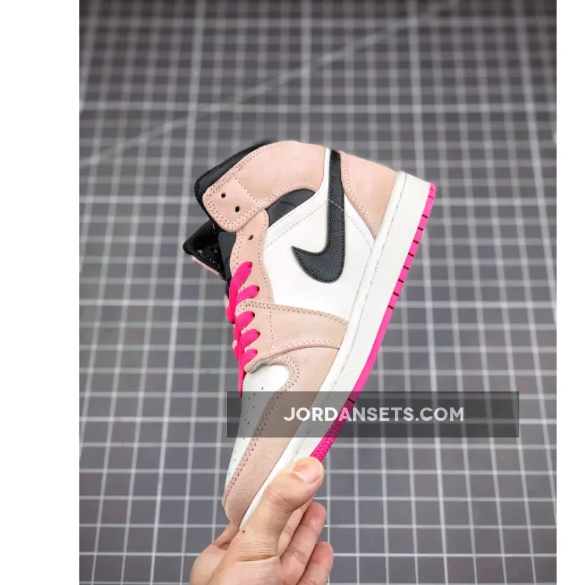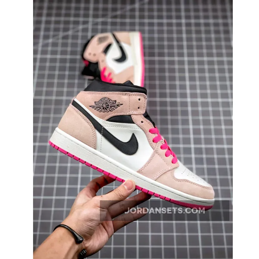 This mid-top Air Jordan 1 features a White leather upper with Pink suede overlays and Black nylon on the Swoosh logo and collar.