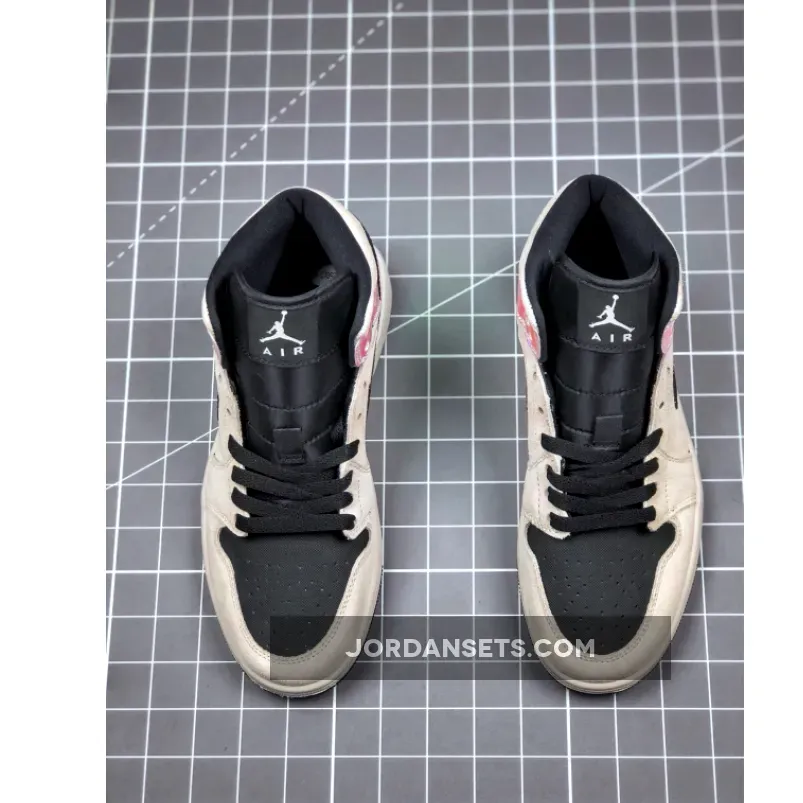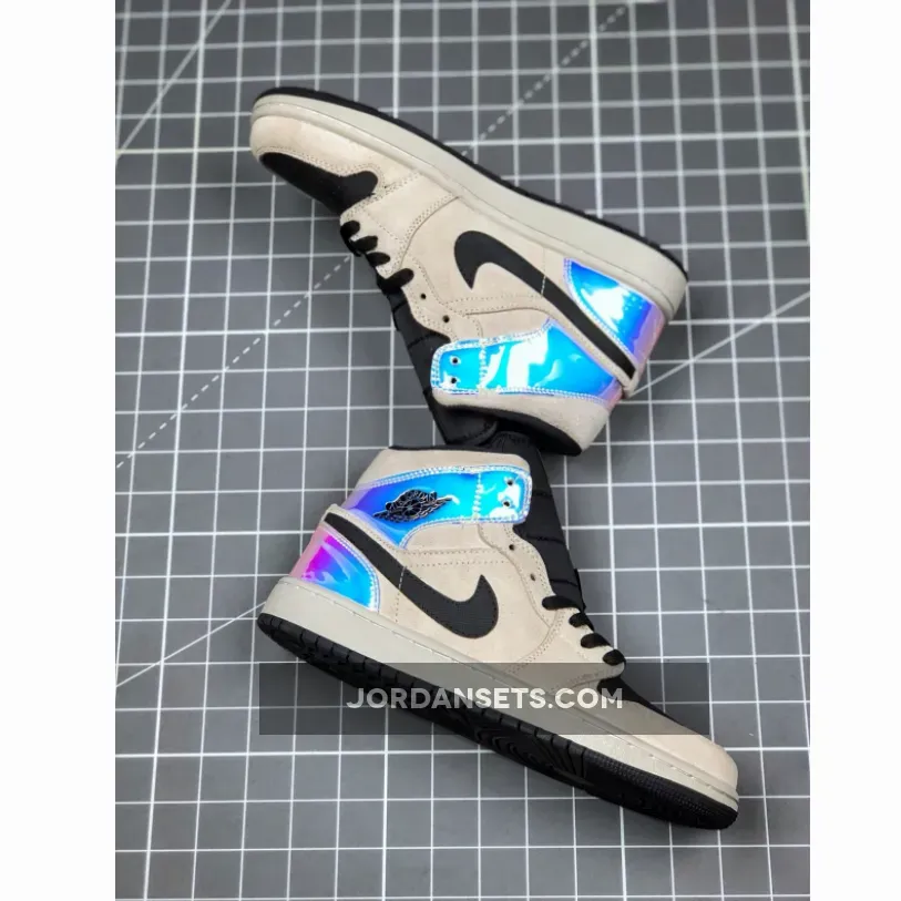 This offering of the Air Jordan 1 Mid features a Pinkish/Beige suede upper with Black covering the ballistic toe cap and Swoosh overlay, nylon tongues, liners, and rubber outsole. Highlighting the shoe is an iridescent heel collar and heel overlay to complete the design.