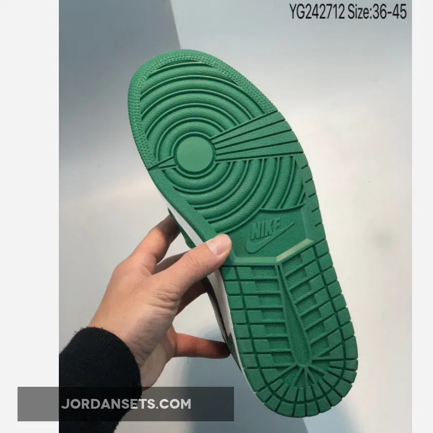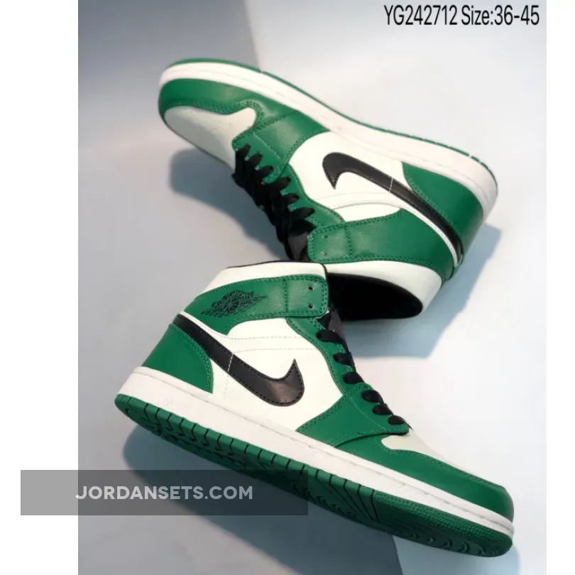 This AJ1 comes with a white upper with green accents, black Nike “Swoosh”, white midsole, and green sole. Being that it is an AJ1 Mid – the black tongue tag opts for a Jumpman as opposed to the oft-preferred Nike Air hit. Buttery soft tumbled leather adds a slight premium touch to this model, while Sail-colored underlays add a bit more to the aesthetic as opposed to just stark white.