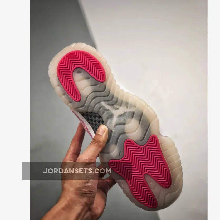It wears a soft white leather upper in a full snowy aesthetic all over. The Snakeskin texture on the mudguard pops up with juicy pink shade. This feature pins a dominant statement on the sneaker board, and it’s very noticeable. Pink inner lining, piping, and the Jumpman logo pop up brightly. A white Jordan 11 midsole sits underfoot for all the strides and strikes the ladies are going to show off.