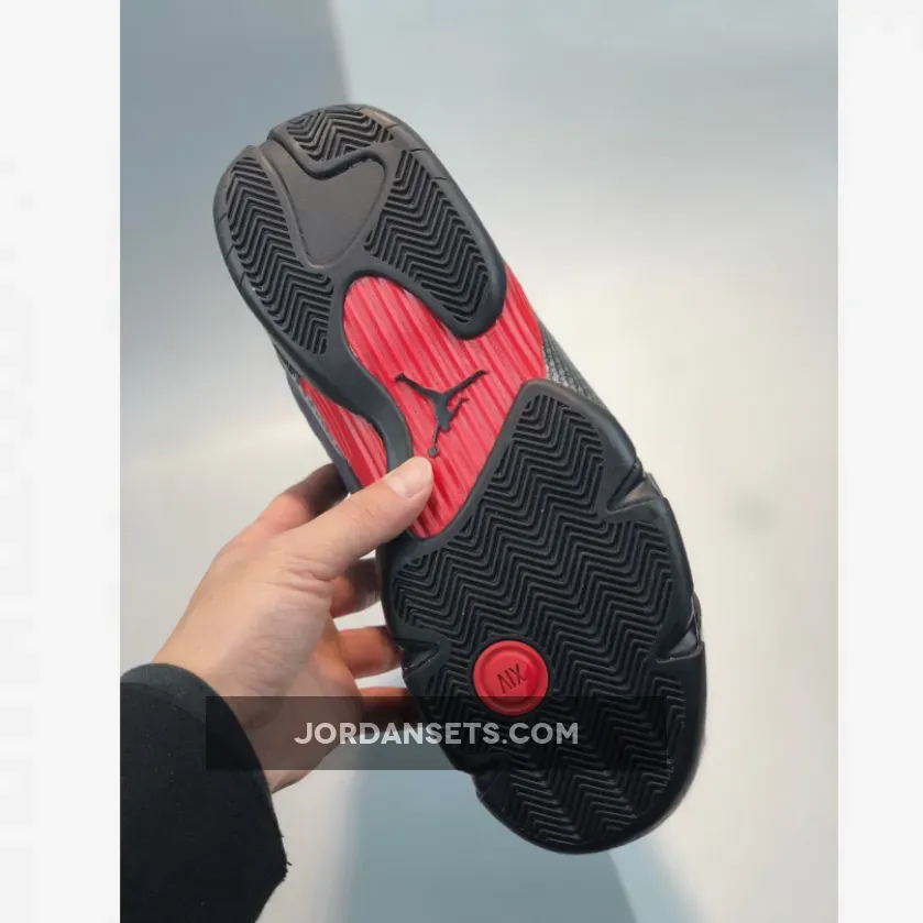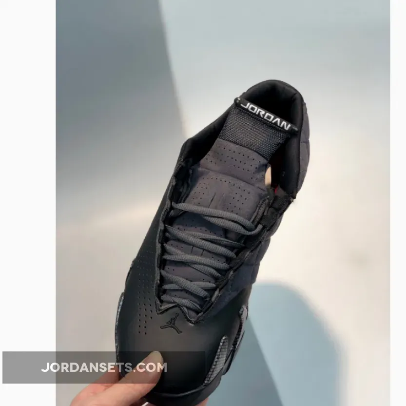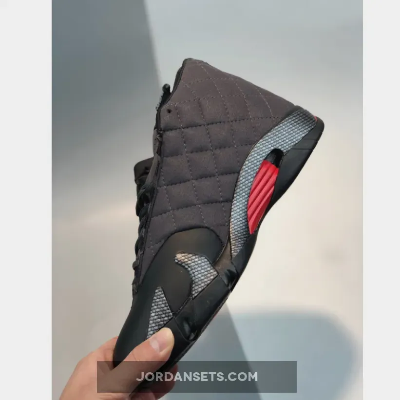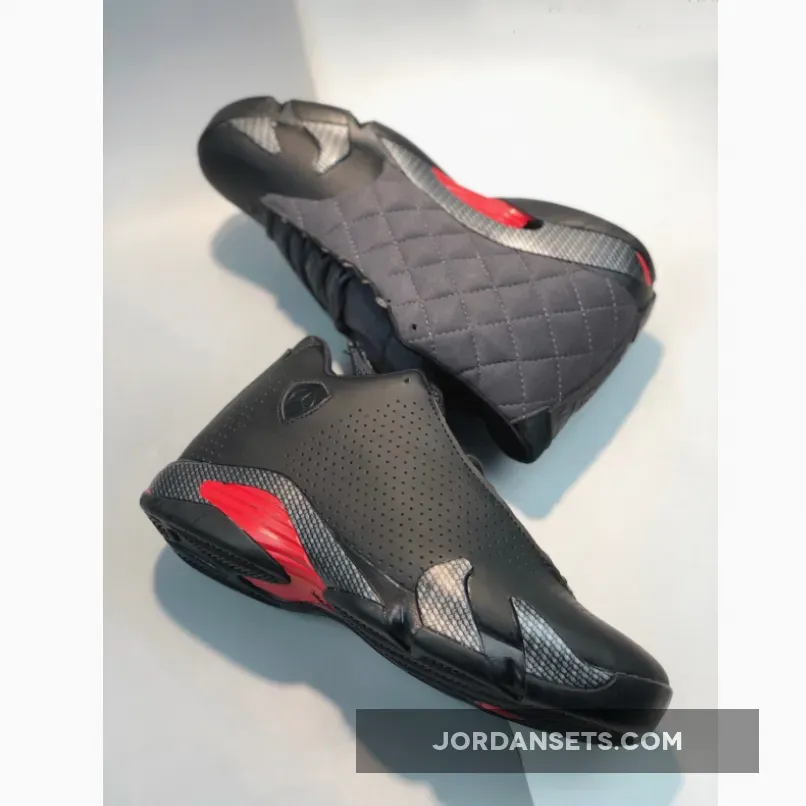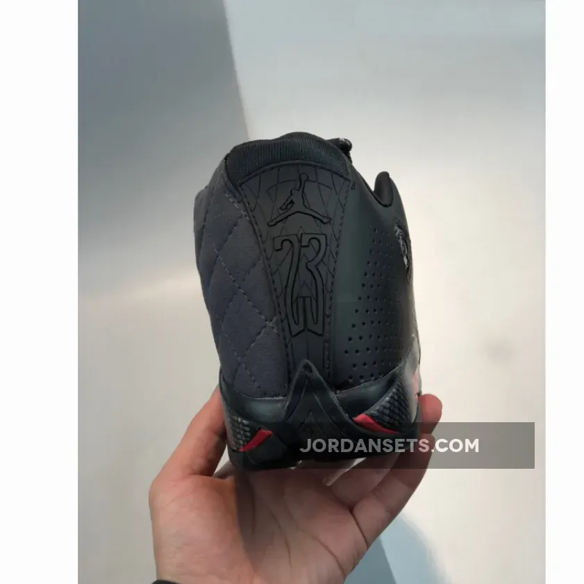Dressed in a Black, Anthracite, and Varsity Red color scheme. This Air Jordan 14 features matte Black perforated leather on the lateral and Anthracite quilted cloth on the medial with Black carbon fiber overlays on the mudguard. White “Jordan” branding on the tongues, a Blacked-out shield logo with Red contrasting accents completes the design.