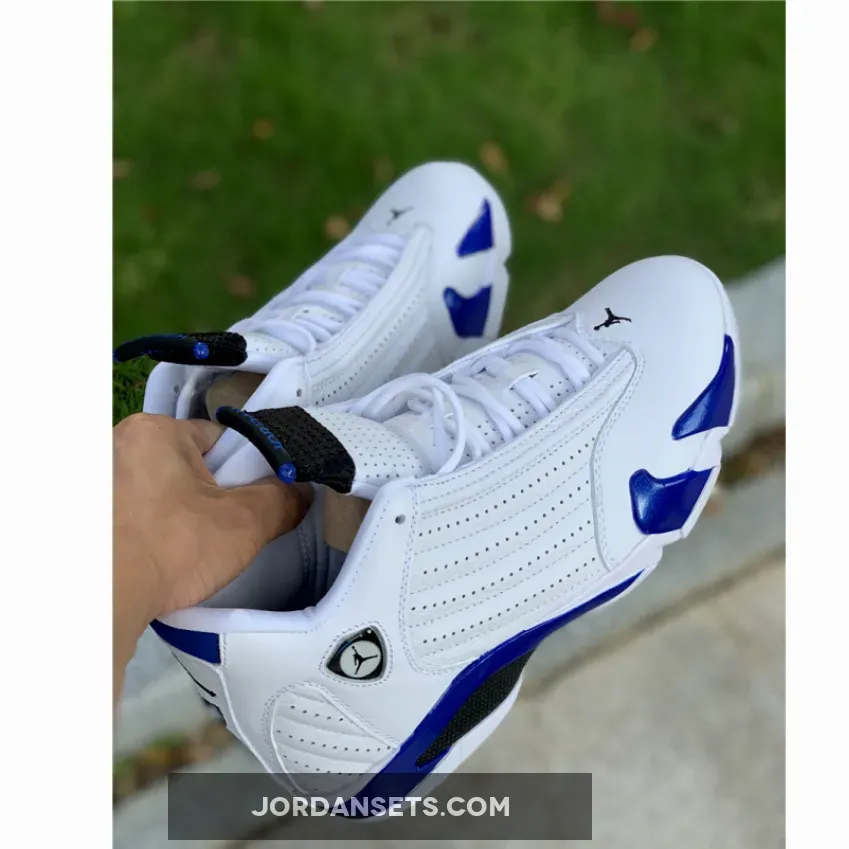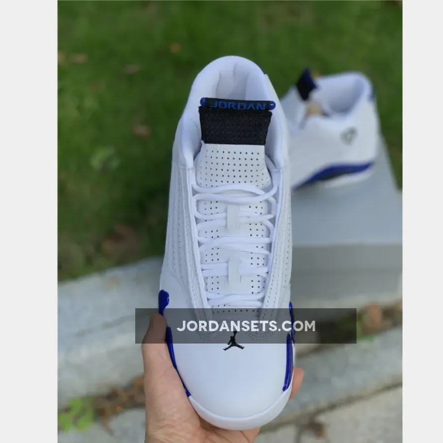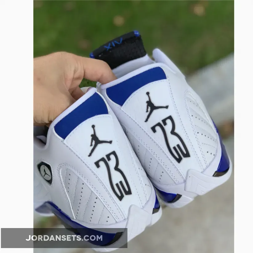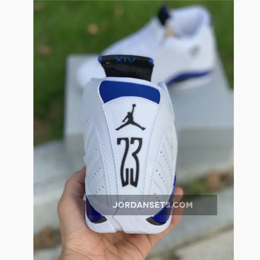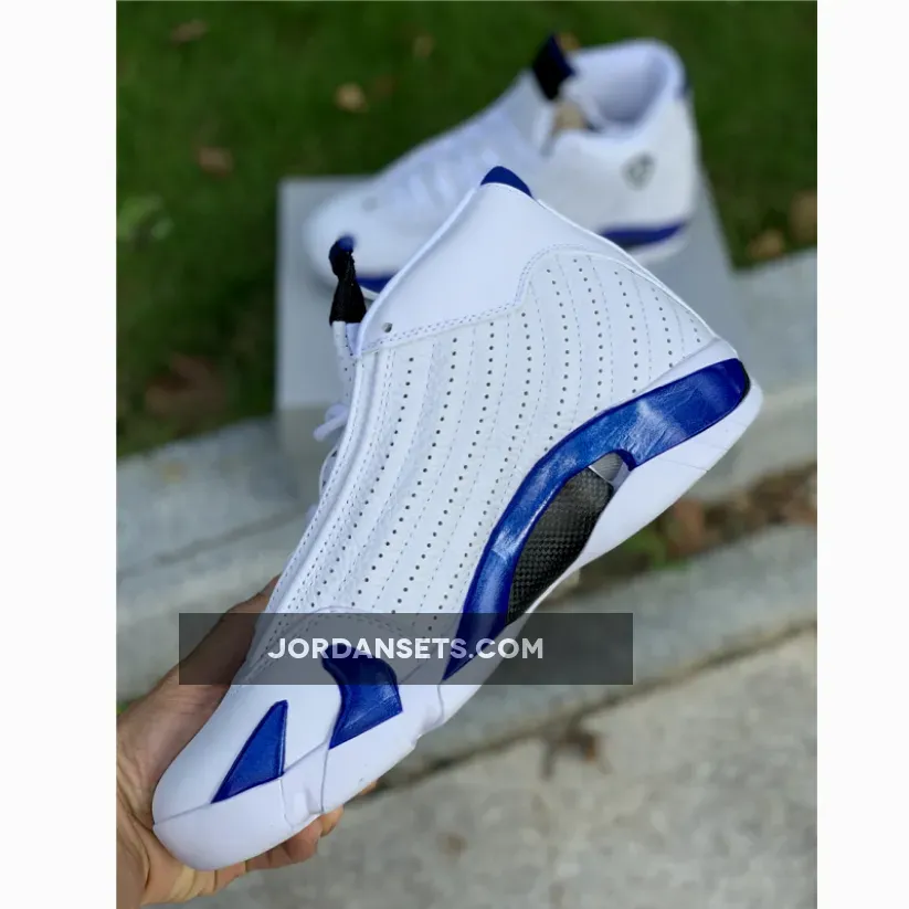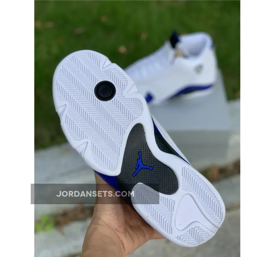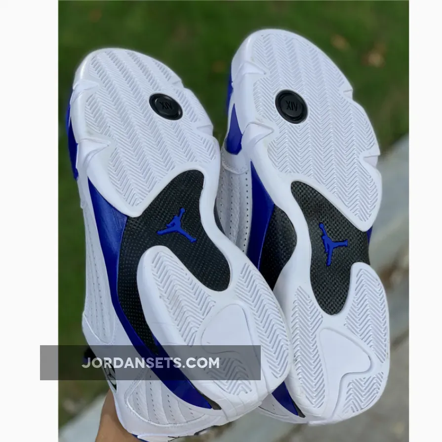 Yet, this Air Jordan retro’s most notable feature is the “Hyper Royal” hue that takes over accents across the upper and sole unit. The tone’s arrangement on the tongue, sockliner, and heel opts for a matte finish, but it revels in a glossy variation along the midsole. Elsewhere, the carbon fiber shank at the midfoot and “XIV”-stamped pivot point under the ball of the foot complement it, while the rest of the surrounding tread keep things classic in “White”.