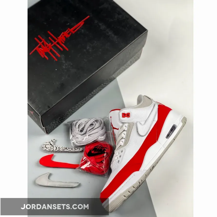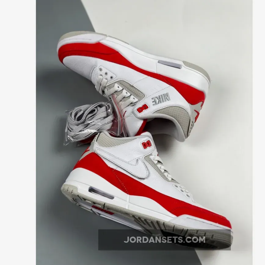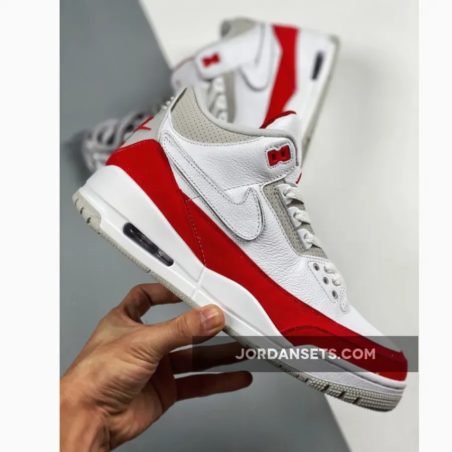 The Air Jordan 3 Retro “Tinker Air Max 1” sneaker features a leather upper. A bold suede varsity red is used for the fenders. The red Jumpman logo embroidered on the tongue echoes the red on the inner tongue. ‘NIKE’ and detachable Swoosh at side. Detachable via Velcro logo. Tinker Hafield’s signature on the inside tongue. There is still an air cushion device on the heel.