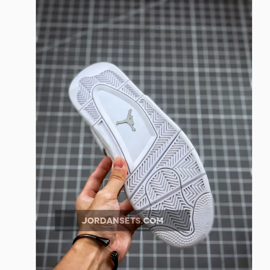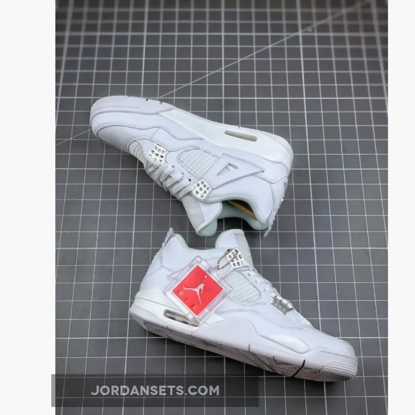 Premium leather adorns the upper in a clean shade of white. This hits virtually everything in sight with the exception of the metallic silver details to the lace locks. The conventional AJ4 details are retained from that ventilated mesh window on the sidewall to the classic Jumpman branding on the tongue.