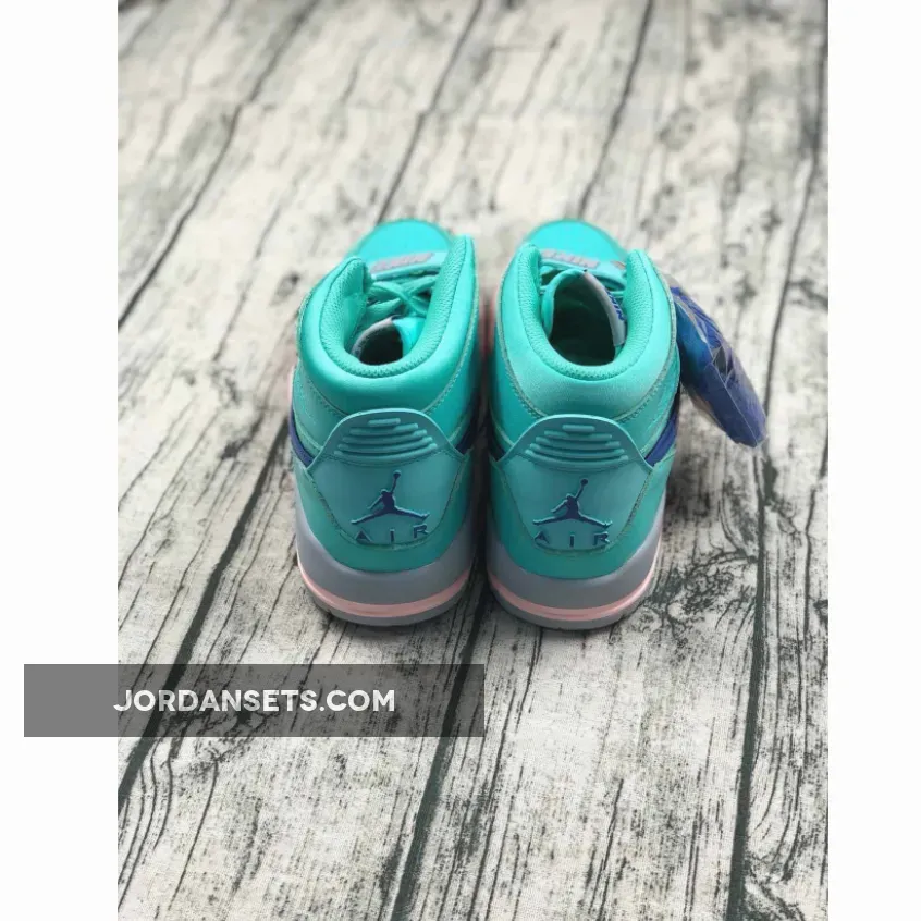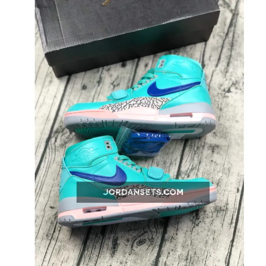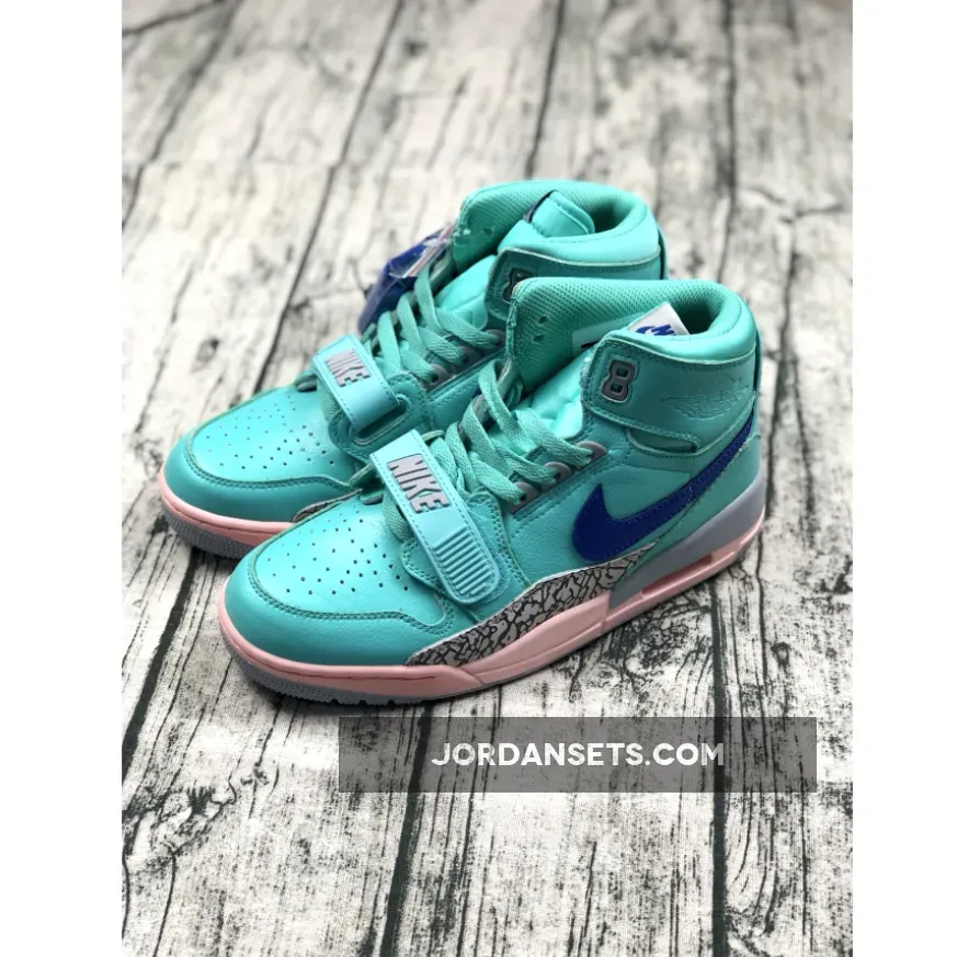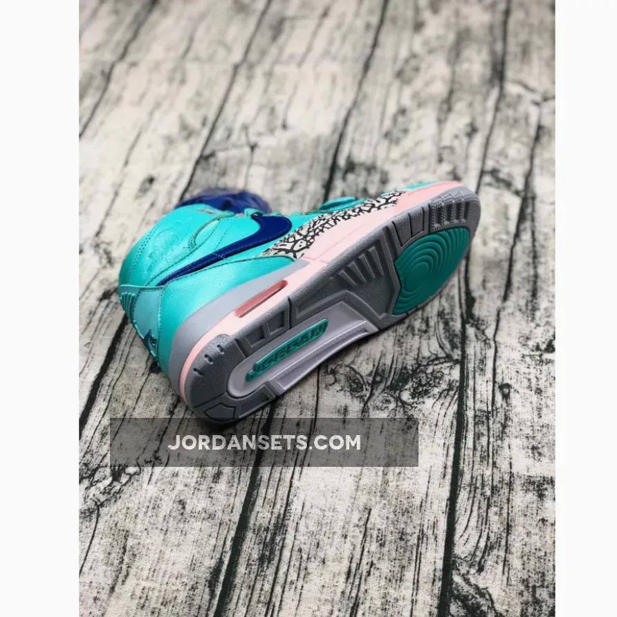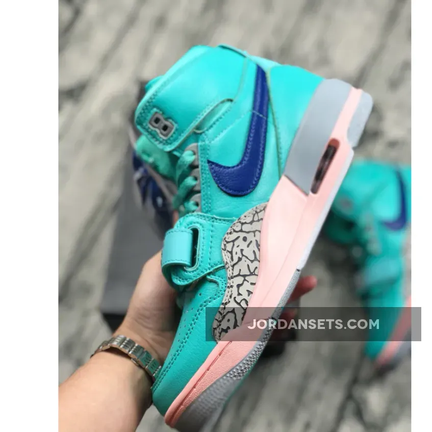 Dressed in a Hyper Jade and Bright Blue color scheme. This Jordan Legacy 312 features a Jade leader upper with Blue accents on the tongue and Swoosh logos. Signature elephant print overlays atop a White midsole and Grey rubber outsole completes the design.
