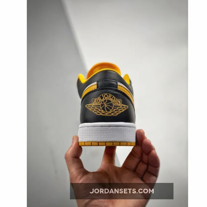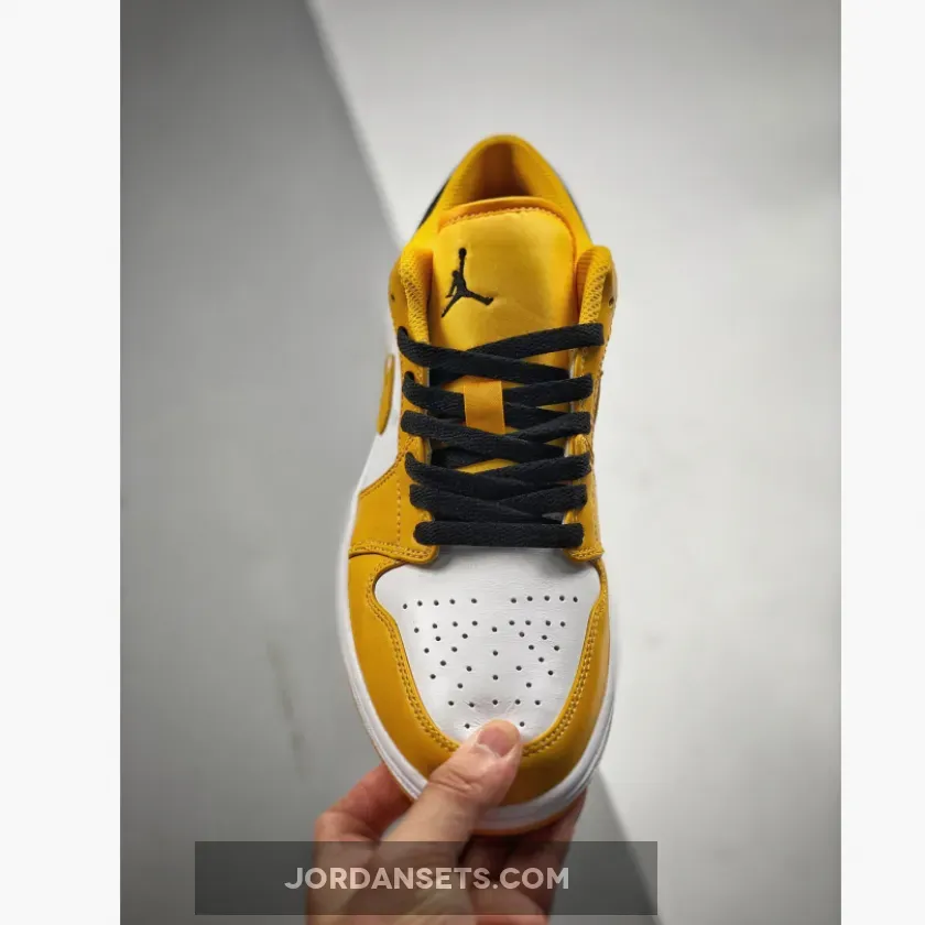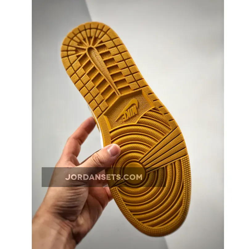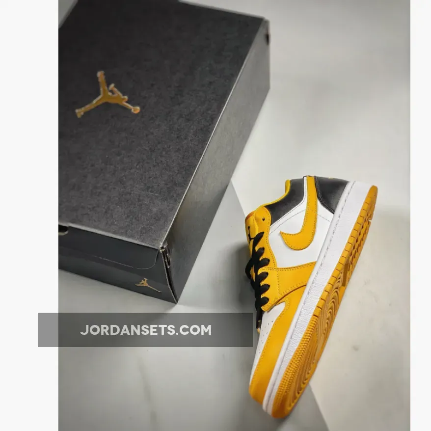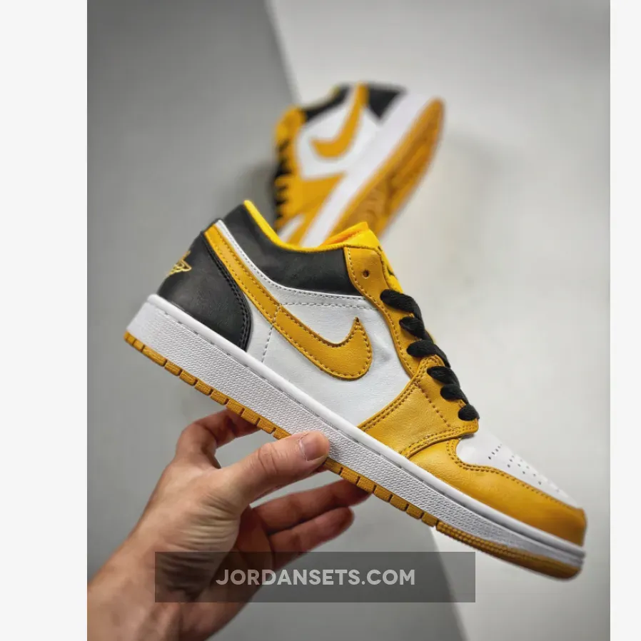 The latest Air Jordan 1 Low release will give you serious bumblebee vibes. Take a closer look at the Air Jordan 1 Low University Gold. This AJ1 Low looks absolutely cheerful with a “White/ Black/ University Gold” colour scheme. The toe box and quarter panels are in smooth “colourless” white leather. The toe box, mudguard and eye stay panel are all in the titular University Gold. The collar and heel counter, on the other hand, are pitch-black as are the laces.