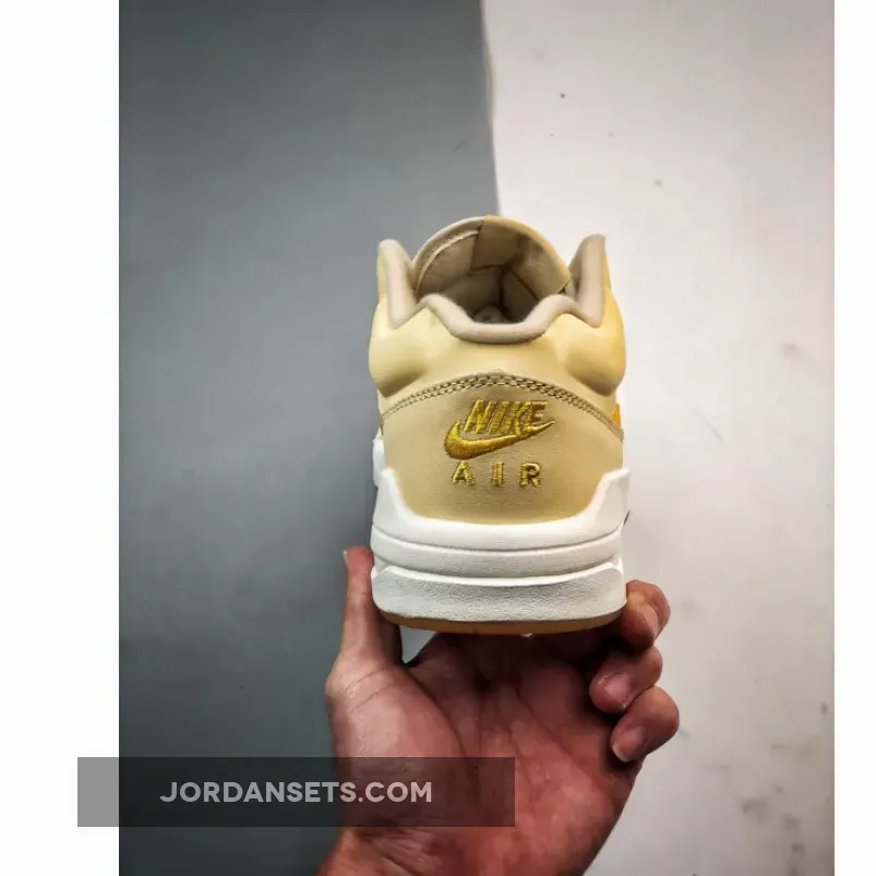 The sneaker celebrates simplicity and elegance, boasting a minimalist color palette that allows finer details to shine. The upper is crafted from a serene blend of beige and cream leather, creating a subtle yet luxurious aesthetic. This understated base is enlivened by golden suede Swooshes and tinted forefoot teeth that sweep across the sides, injecting a vibrancy reminiscent of sun rays.