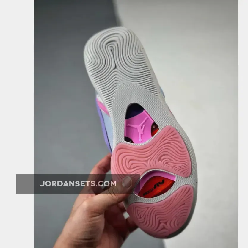 The majority of the upper is decorated with light purple, which is juxtaposed by darker hues on the TPU overlays on the toe and eyelets. On the tongue tag and around the medial heel, Dongdan emblems are deftly placed. The lateral heel as well as the heel tab continue to sport the standard Jordan branding. High-quality cushioning is provided by the foam midsole, which is strengthened with TPU reinforcements on the toe as well as the midfoot.